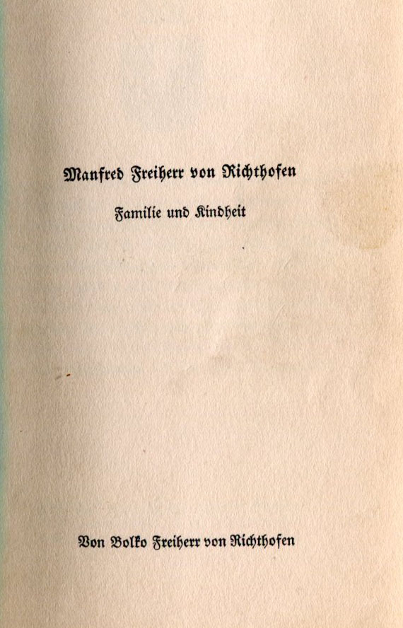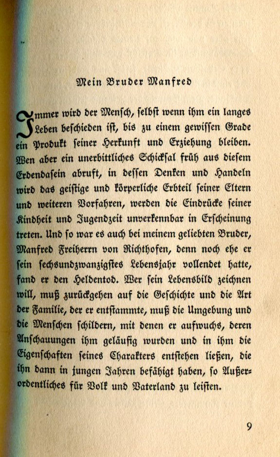 Even if a man is destined to live a long life he remains the product of his heritage and education. However when he is tragically fated to depart this earthly existence early on, thoughts and actions from his childhood and youth must serve to commemorate the spiritual and physical inheritance from his parents and other ancestors. Thus it is for my beloved brother Manfred, Baron von Richthofen, taken before he had finished his twenty-sixth year on earth. He met with a hero's death. Whosoever would wish to describe his life must return to the history of the family from which he sprang, must describe the environment and the people with whom he grew up. He must make manifest the thoughts and demonstrate the character which enabled the young man to achieve extraordinary deeds for his people and his fatherland. |