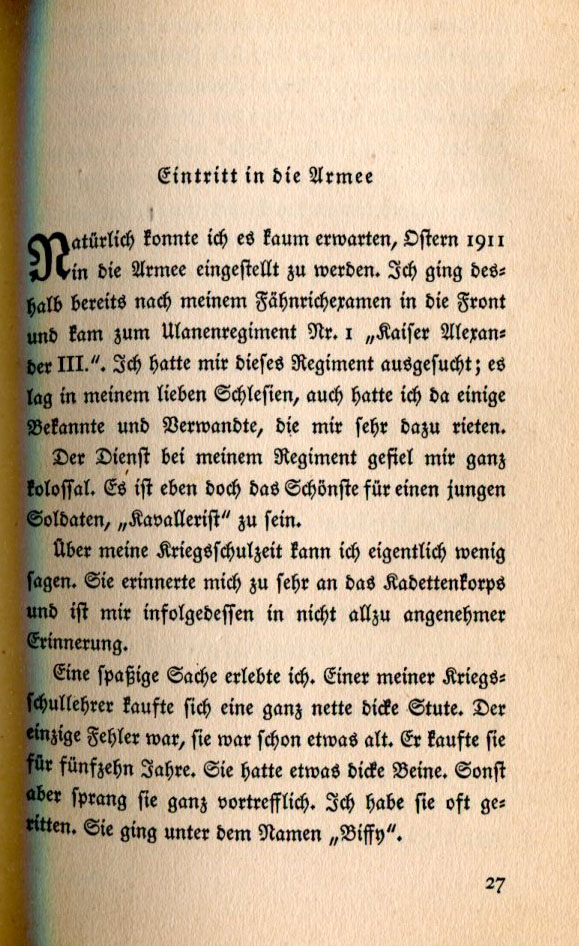 Naturally I could hardly wait to be recruited into the army at Eastertime, 1911. Immediately after passing my junior officer exams I went to the Front and arrived at Ulan Regiment No. 1, Kaiser Alexander III. I had sought out this regiment. It was located in my beloved Silesia and I had acquaintances and relatives to whom I was recommended. Serving in my regiment pleased me enormously. To a young soldier being a cavalryman is the greatest thing to be. I have little to say about my days in the war college. They reminded me too much of the Cadet Corps and thus are not very pleasant memories. I remember one amusing event. One of my war college teachers bought himself a nice, fat mare. His only mistake was she was rather old. When he bought her she was fifteen years old. She had rather thick legs but she was an excellent jumper. I often rode her. She went by the name "Biffy." |