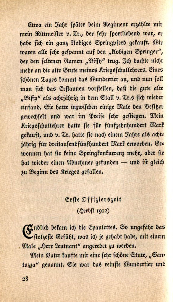 About a year later my regimental commander, v. Tr., a sports-loving man, told me he had bought a plump jumping horse. We were all very curious about a chunky horse with the same odd name, "Biffy." I didn't think about my war college teacher's old mare. One beautiful day behold the wonder horse arrived and you can image the astonishment when the same old "Biffy" was found in the stall of v. Tr. as an eight-year-old. In between times she had changed owners a few times and her price had risen significantly. My war college teacher had bought her for fifteen hundred Marks and a year later v. Tr. bought her as an eight-year-old for three thousand, five hundred Marks. She no longer won jumping competitions but she had found another buyer — and died at the beginning of the war. (Fall 1912) Finally I got my epaulettes. It may have been my proudest moment the first time I was addressed as "Herr Leutnant" [Lieutenant.] My father bought me a very beautiful mare named "Santuzza." She was a pure and indestructible wonder horse. |