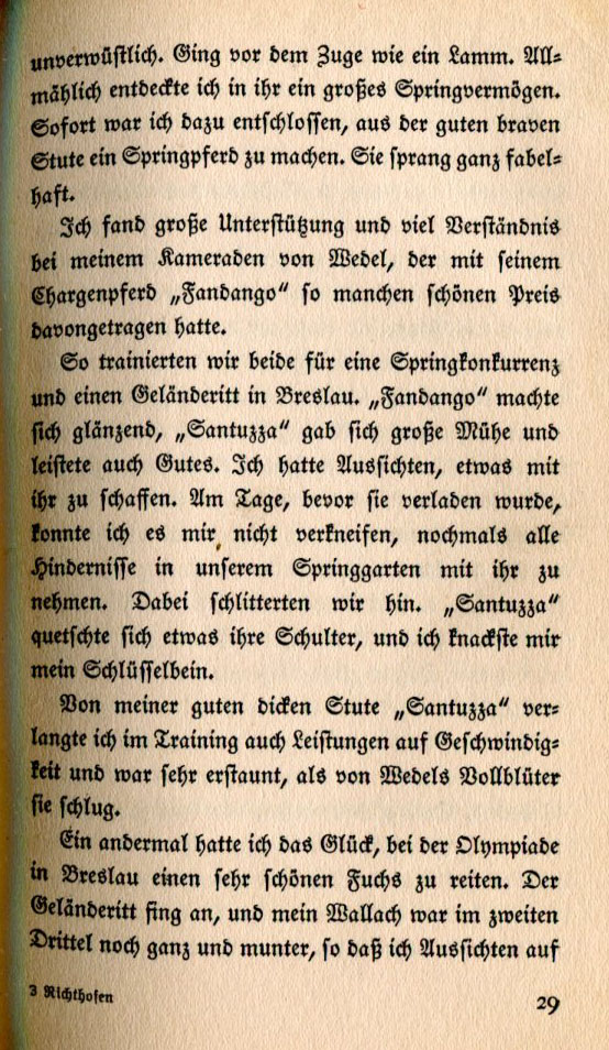 I found great support and understanding in my comrade von Wedel, who had taken home many beautiful prizes with his charger, "Fandango." So the two of us trained for a jumping competition and cross country race in Breslau. "Fandango" did magnificently and "Santuzza" put forth great effort and achieved great things. I had intentions of competing with her. On the day before she was to be transported I couldn't resist the urge to jump all the barriers in our jumping arena. We slipped. "Santuzza" fractured her shoulder and I cracked my collarbone. In training I had also wanted nice and plump "Santuzza" to build up some speed and I was astonished when she beat von Wedel's thoroughbred. Another time I had the good fortune at the Olympiad in Breslau to ride a beautiful chestnut horse. The race began and by the second third of the course my gelding was still perky, which gave me hopes of winning. |