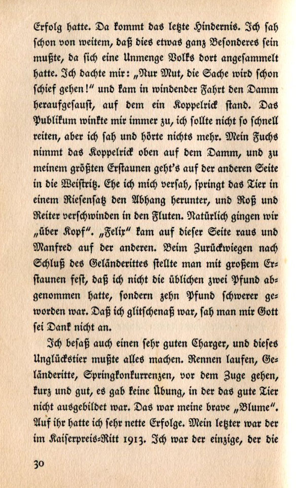 We came to the last hurdle and from afar I could see that something unusual must be in place since a large crowd of people were assembled there. I thought to myself, "Have courage, things are going to get tricky!" Around the bend in the road there was a dam with fence hurdle. The public indicated with a nod that I should not ride so fast but I didn't see or hear anything. My chestnut jumped the fence over the water and to my great surprise the Weistritz River was on the other side. Before I could react the horse jumped in one great leap. Both horse and rider disappeared into the river. Naturally we went head over heals. "Felix" fell to one side and Manfred to the other. When it came time for the weigh-in after the race everyone was astonished that I hadn't lost the usual two pounds but rather had added ten pounds of weight. Thank God everyone didn't see that I was soaked to the skin. I also owned a very fine charger and this unfortunate animal had to do everything. It ran races, did cross-country and jumping competitions, performed military manoeuvres. The long and short of it was that the good beast was trained for everything. She was my brave "Blume" [Flower] and I had great success with her. My last award was the Kaiser Riding Prize of 1913. I was the only one who had |