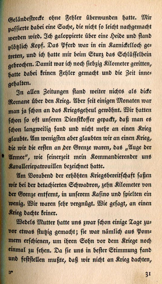 conquered the course with no errors. I had an experience not easily forgotten. I was galloping in a meadow and found myself suddenly upside down. The horse had stepped into a rabbit hole and I broke my collarbone in the fall. Notwithstanding, I rode sixty kilometers and didn't make a mistake plus I did it in excellent time. In all the newspapers nothing was more widespread than thick reports on the war. But after a few months people became accustomed to the war cries. We had packed our service bags so often that we soon found it tedious and no longer believed in a war. But we soon after believed in it when were first went to the front and became the "Eyes of the Army" as our commanders had designated us cavalry patrolmen. During the prior evening on high alert we sat with the detached squadron, ten kilometers from the front in our officer's mess and played cards for a while. We were quite content. As they say, no one thinks about war. A few days before Wedel's mother made us feel apprehensive. She arrived from Pomerania in order to see her son once more before the war. Seeing us in good moods and concluding that we were not thinking about the war |