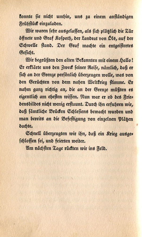 she could not resist inviting us to a decent breakfast. We were extremely put out when the door suddenly opened and Count Kospoth, the county commissioner from Öls stood at the threshold. He had a flabberghasted look on his face. We greeted our old acquaintance with a Hello! He told us the reason for his trip, which was specifically to personally inspect the border to see if the rumors of impending war were true. He was certain that those near the border would know. He was somewhat astonished by our peaceful presence. We learned from him that all the bridges in Silesia were being watched and people were prepared to secure several individual places. We quickly convinced him that war was out of the question then we continued our celebration. The next day we were back in the field. |
