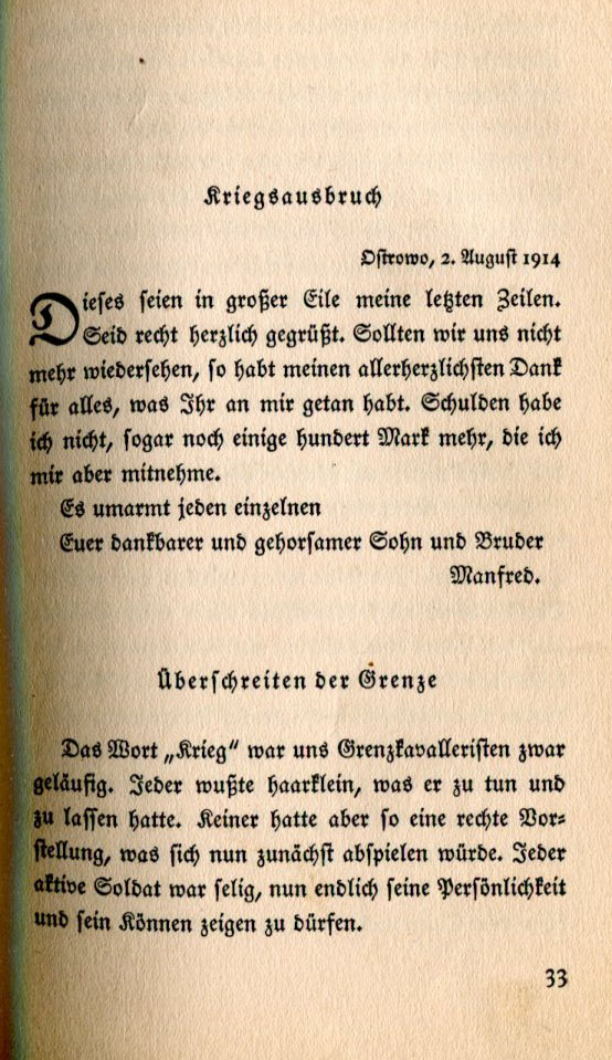Ostrowo, August 2, 1914 With great haste these are my last lines. I send you greetings. Should we not see each other again, you have my heartfelt thanks for everything you have done for me. I have no debts. In fact I have a few hundred Marks more than I took with me. A hug for each one of you. Your grateful and obedient son and brother, Manfred. The word "War" was quite familiar to the border cavalry. Each of us knew exactly what he had to do and what he should not do. But none of us could imagine what would play out next. Every active soldier was eager for the chance to show his courage and ability. |