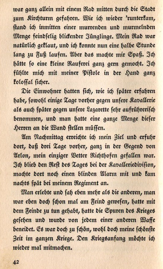 rode a bicycle alone through the city to the church tower. When I came back down I stood amid a group of murmuring, hostile-looking boys. Naturally my bike was stolen and I had to walk for half an hour, but this made me happy. I would have enjoyed a bit of roughhousing. With a pistol in my hand I felt like a titan. I learned a day later that the residents had rioted against our cavalry and then later our field hospital and an entire group of them had to be put up against the wall. At midday I reached my destination and learned that three days before in the region of Arlon a Richthofen cousin had been killed. I spent the rest of the day with the cavalry division, participated in yet another surprise drill and then returned to my regiment that night. Some people experience more things than others. Some had already been among the enemy, confronted them, saw the marks of war, been envied for their weapons. It was all too beautiful, indeed the best time in the entire war. I wish I could relive its beginnings again. |