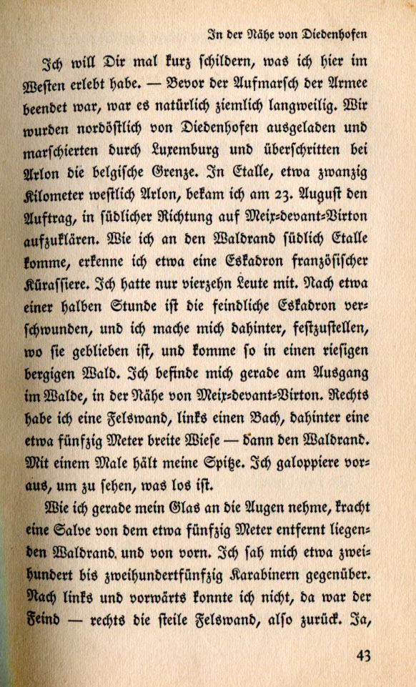 In the vicinity of Diedenhofen I will briefly describe to you what I experienced here on the Western Front. — Until the army's march was over things were quite boring. We were moved northeast from Diedenhofen and marched through Luxemburg, crossing the Belgian border at Arlon. In Etalle, about twenty kilometers west of Arlon, I received orders on the 23rd of August to reconnoiter in a southern direction towards Meix-devant-Virton. As I approached the edge of the forest south of Etalle, I noticed a squadron of French cavalry. I only had fourteen men with me. After about a half an hour the enemy squadron disappeared. I was backtracking to determine where they were staying when I came upon a huge, mountainous forest. Leaving the forest I found myself in the vicinity of Meix-devant-Virton. To my right was a rockface, to my left a stream, and fifty meters behind me a wide meadow, then the edge of the forest. The point man stopped and I galopped up to see what was wrong. As I put the telescope to my eye a salvo volleyed about fifty meters away from the edge of the forest. I saw between two hundred and two hundred and fifty riflemen. I couldn't go left or forward; there was the enemy. To the right the rock wall. I had to retreat. |