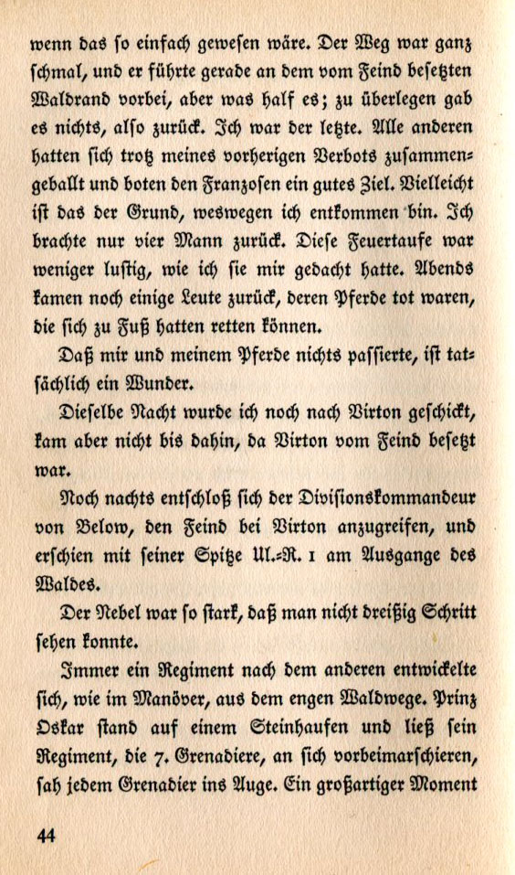 Oh, if it had only been that easy! The pathway was quite small and it went past the enemy-occupied edge of the forest. This wouldn't work because there was no way around or through. I was the only one left. Despite my previous orders all the others had tried to bolt past, thus providing the French with excellent targets. Perhaps that was the reason I escaped. I only brought four men left. Baptism by fire was less entertaining than I thought it would be. In the evening some men returned because their horses were dead. They had to rescue themselves on foot. It's a wonder that neither I nor my horse were injured. The same night I was sent back to Virton but not to the same part of Virton occupied by the enemy. One night afterwards Division Commander von Below decided to engage the enemy in Virton. He went with his point guard, Uhland Regiment No. 1 to the clearing beyond the forest. The fog was so thick that you couldn't see thirty paces in front of you. One regiment after the other manoeuvered beyond the narrow forest path. Prince Oskar stood on a pile of boulders and inspected his regiment, the 7th Grenadiers, as it marched by. He looked each grenadier in the eye. It was a marvelous moment |