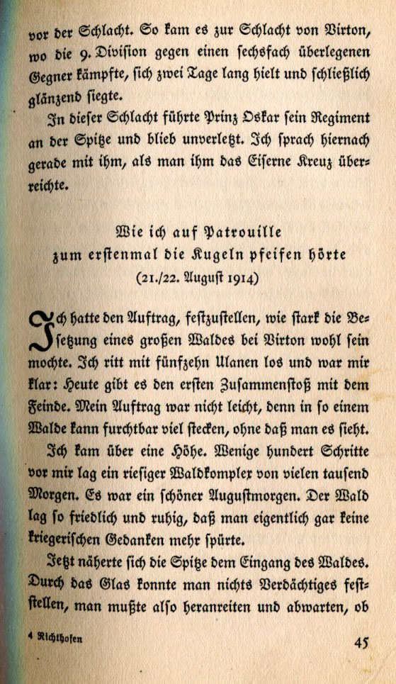 before the battle. Thus occurred the Battle of Virton, where the 9th Division fought against an enemy six times as large for two days and eventually won. In this battle Prince Oskar rode at the head of his regiment and remained uninjured. Afterwards I spoke with him as he was given the Iron Cross. and for the First Time heard the Bullets fly by. (August 21st/22nd, 1914) I was given orders to determine how strong the occupation forces were in a large forest near Virton. I rode out with fifteen men of the Uhlan Regiment. It was clear to me that today I would have the first encounter with the enemy. The assignment wasn't easy. Many frightening things can hide in a forest which remain unseen. I came to some high ground. Less than a hundred paces from me there was a massive forest complex of many thousands of acres. It was a beautiful August morning. The forest was so peaceful and quiet that there was no hint of war. The point approached the entrance to the forest. Nothing suspicious was detected in the telescope. We had to ride in and wait to see if |
