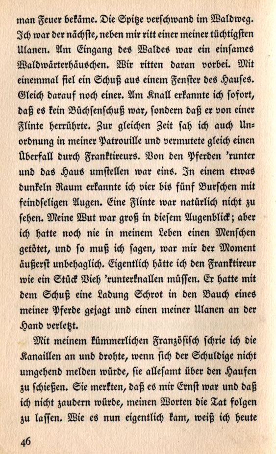 there would be enemy fire. The point disappeared on the forest path. I was next. Near me rode one of my most capable Uhlan cavalrymen. At the entrance to the forest was a solitary woodsman's cottage. We rode past it. A shot was fired from the window of the cottage. Then came another. From the sound I knew immediately that this wasn't buckshot. It was the sound of a flint rifle. At the same time I noticed the chaos in my patrol and surmised this must be an encounter with French guerilla fighters. Down from the horses and around to the house. In a dark space I recognized four to five young men with hostility in their eyes. Of course, I did not see any flint rifles. My courage was great at that time but I had never seen a man killed before and I must say the it was an extremely disconcerting moment. At any moment I might have to strike down the French fighter like a head of cattle. He had put a shot in the stomach of one of my horses and injured the hand of one of my Uhlan soldiers. In my minimal French I cried out to the scoundrels if the guilty party did not show himself I would shoot the entire group of them. They saw I was serious and that I would not hesitate to make good on my threat. To this day I'm not sure if I could have done it. |