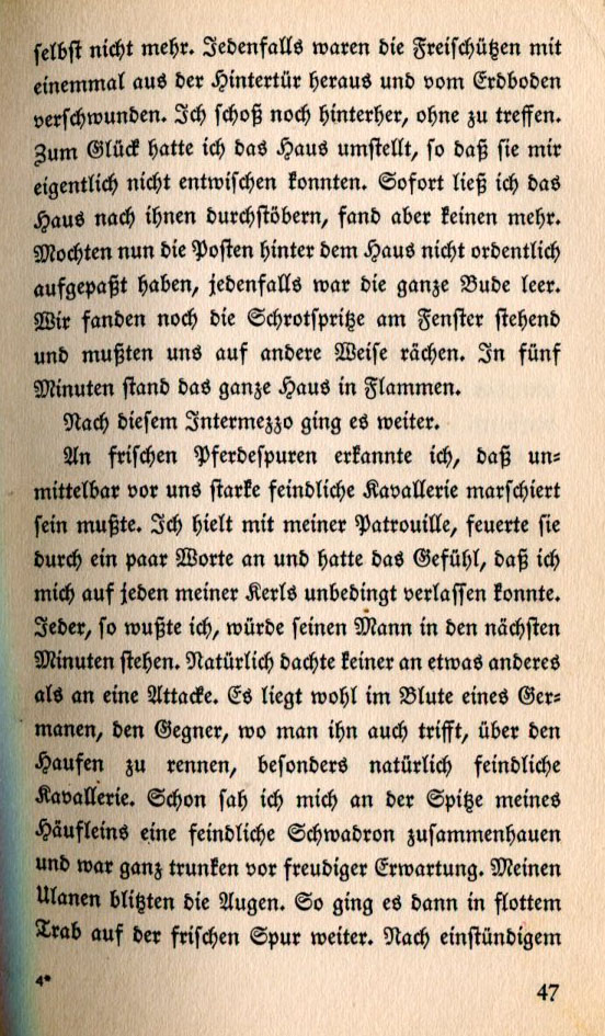 The free shooters went out the back door and disappeared without a trace. I shot at them but didn't hit anything. Fortunately I had the house surrounded so they couldn't escape. Immediately afterwards I had the house searched but didn't find anybody else. Perhaps the sentries at the back of the house hadn't paid close enought attention. In any event, the place was empty but we did find the rifle propped up on the window. We had to exact out revenge in a different fashion. Five minutes later the entire cottage was in flames. After this intermezzo we proceeded farther. Fresh horse tracks alerted me that not long before us a heavy concentration of enemy cavalry had marched through. I stopped with my patrol, fired them up with a few words, then had the feeling that I could unconditionally rely on each one of my men. In the next few minutes each would face his enemy and each would consider nothing other than attacking him. It lies in the German blood to charge after the enemy, especially hostile cavalry. I saw myself at the head of this little group pressing forward on the hostile squadron and I was drunk with anticipation. The eyes of my Uhland soldiers glistened with lightning. At a fluid trot we continued on the trail. After an hour's |