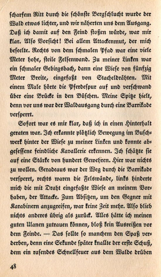 intense ride through the most beautiful of mountain passes the forest thinned out and we approached its exit. It was clear to me I would engage the enemy. But with caution! And with all the courage I could muster. To the right of the path was a steep, several meter high rockface. To the left was a small stream, then a meadow fifty meters wide surrounded by barbed wire. Suddenly the horse tracks stopped and disappeared over a bridge in the bushes. The point stopped. Before us the way out of the forest was blocked by a barricade. Immediately it was clear to me that I was in an ambush. I immediately saw movement in the bushes behind the meadow to my left and saw the enemy cavalry. I estimated about a hundred armed men. This was not a good place to be. There was no way through the barricade, to the right was the rock wall, to the left was the meadow surrounded with wire thus hindering my inclination to attack. There was no time to dismount and round up the enemy with our rifles. That left no option other than to go back. My good Uhlan soldiers would rely on me to do anything but ride away from the enemy. — That would spoil their fun. A second later the first shot sounded then rapid fire issued from the forest. |