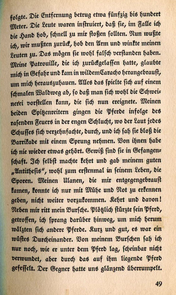 ![]() | The distance was between fifty and a hundred meters. The men were instructed to quickly come to me if I raised my hand. I knew we had to retreat. I raised my arm and signalled to my men. They may not have understood me. The patrolmen I had left behind must have believed I was in danger. They came charging forward wildly to rescue me. All this took place on a narrow forest path so one can image the chaos that ensued. Due to the rapid fire both my pointmen rode their horses into the narrow pass where the sound of each bullet was ten times as loud. I saw them take the barricade in one jump. I've never heard a word about them since. They are most certainly in prison. I turned myself around and for the first time in his life I gave my good old horse "Antithesis" the spurs. It took great effort to indicate to my Uhlands that they should not come to me. Turn around and get out! My orderly rode next to me. Suddenly his horse fell. I sprang out of the way. Other horses galloped around me. It was quite the brouhaha. I saw that my orderly was under the horse, not wounded but pinned underneath. The enemy had taken us by surprise. |