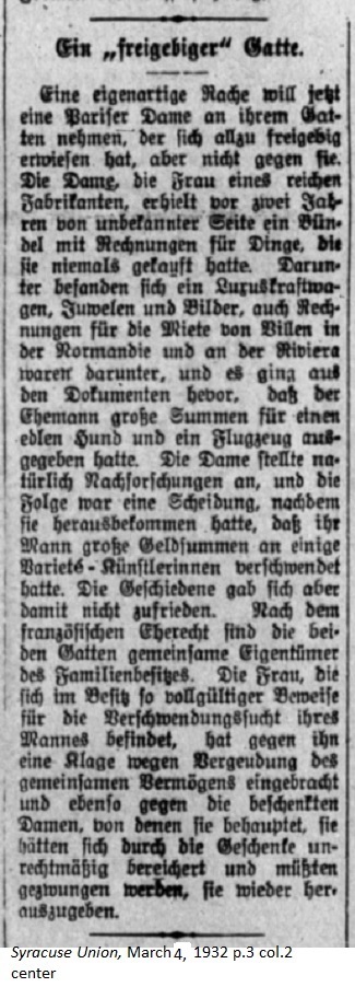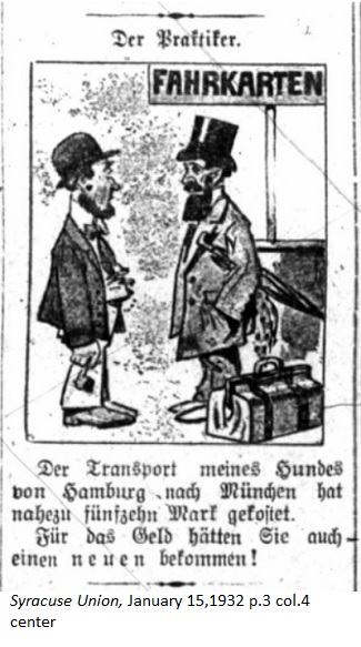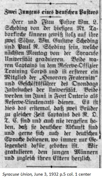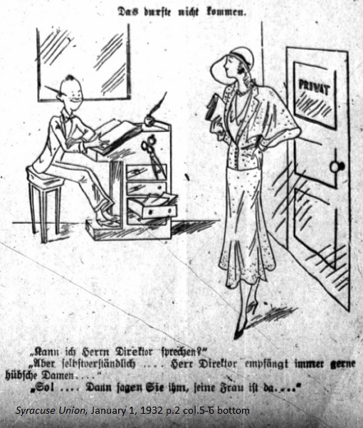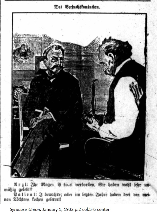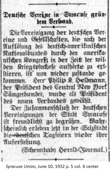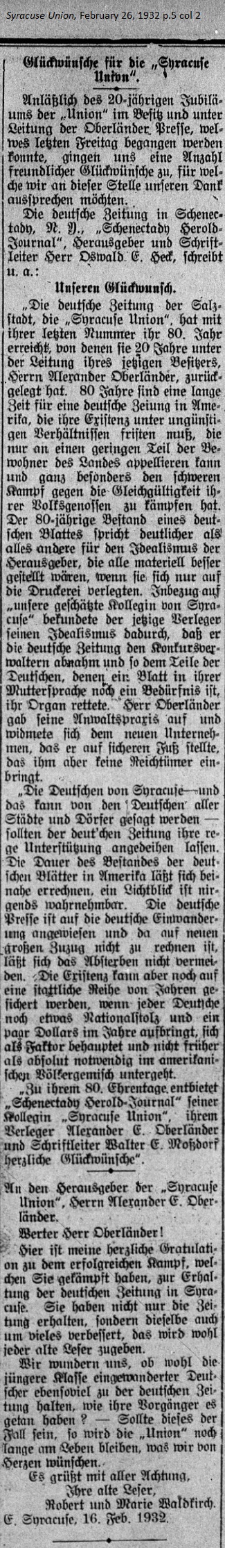 February 26, 1932 page 5 _____ From the German newspaper in Schenectady, N.Y., Schenectady Herold-Journal, publisher and editorial manager Mr. Oswald E. Heck, et.al.: "The German newspaper of Salt City, the Syracuse Union, has reached the last issue of its 80th volume, the last 20 years of which have been under the management of its owner, Mr. Alexander Oberländer. 80 years is a long time for a German newspaper in America, which had to maintain its existence under unfavorable circumstances. Only a small portion of the residents of this country can make this claim especially with regard to the difficult battle it had to wage against the apathy of its fellow Germans. The 80 year survival of a German paper speaks more clearly than all else for the idealism of the publisher, who might have postponed publication until times were more advantageous. With regard for "our esteemed sister newspaper in Syracuse" the current publisher expressed his optimism when he took the German newspaper out of the hands of the bankruptcy administrators and saved it for the portion of the German community, which needed a publication in its own native language. Mr. Oberländer gave up his law practice and dedicated himself to the new enterprise until it was on more secure footing, even though it did not yield him riches. "The Germans of Syracuse — and this can be said by the Germans of all cities and towns — should actively support their German newspaper. The duration of the existence of German newspapers in America may be counted as a beacon making the obscure discernible. The German Press is for the German immigrant, and since a new large wave of immigration is not expected, let's not avoid the issue of decline. However existence can still be assured for a considerable number of years if every German musters national pride and a few dollars to declare themselves a unique entity and not dissolve into the American melting pot until absolutely necessary. "On its 80th birthday the Schenectady Herold-Journal extends to its sister newspaper, the Syracuse Union, its publisher, Alexander E. Oberländer, and its managing editor, Walter E. Mossdorf, our heartfelt congratulations." To the Publisher of the Syracuse Union, Mr. Alexander Oberländer Dear Mr. Oberländer. Here are heartfelt congratulations on the successful battle you have waged to keep a German newspaper in Syracuse. You not only kept the newspaper but much improved it, as any old reader can attest. We wonder if the new generation of immigrant Germans will support the newspaper as much as their predecessors did? Should this be the case, then the Union will be alive for a long time. We hope it will, with all our hearts. With most respectful greetings, Your Old Readers,