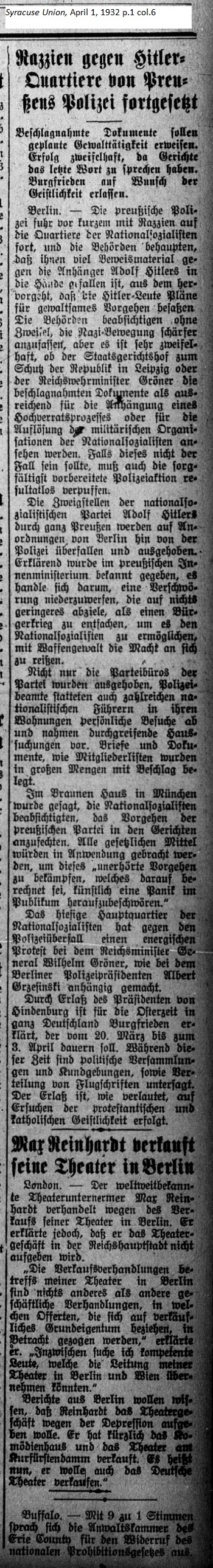 April 1, 1932 page 1 _____ Confiscated Documents supposed to justify planned use of force, Results doubtful, the Courts will have the Last Word. Truce decreed by Request of the Clergy The branches of Adolf Hitler's National Socialist Party throughout Prussia were raided and searched according to orders from Berlin. Clarification was rendered by the Prussian Interior Minister, who said it dealt with thwarting a plot aimed at nothing less than initiating a civil war in order to allow the National Socialists to seize power by armed force. Not only the branch offices were raided, police officers paid personal visits to numerous National Socialist leaders in their homes and conducted thorough searches. Letters and documents in great numbers were confiscated. It was stated in the Brown House in Munich that the National Socialists intended to challenge the incursions of the Prussian Party in Federal Court. All legal measures were brought to bear in order to "fight against this unheard of incursion, which was counted upon to create public panic." The local headquarters of the National Socialists has registered energetic protest against the Police raid with Reichs Minister Wilhelm Gröner along with Police President Albert Grzesinski. By decree of President von Hindenburg, for the Easter holiday a truce had been declared for all of Germany lasting from March 20th to April 3rd. During this time period political assemblies and announcement were banned, as were distribution of flyers. The decree, as announced, resulted from a request by the Protestant and Catholic clergies. "The sale of my theater in Berlin is nothing other than a business transaction for the sale of the property," he stated. "Meanwhile I am searching for competent people who will take over the management of my theaters in Berlin and Vienna." Reports from Berlin indicate that Reinhardt wants to give up the theater business because of the Depression. He recently sold the Comedy House and the theater on Kurfürstendamm. It now appears he also wants to sell the German Theater. |