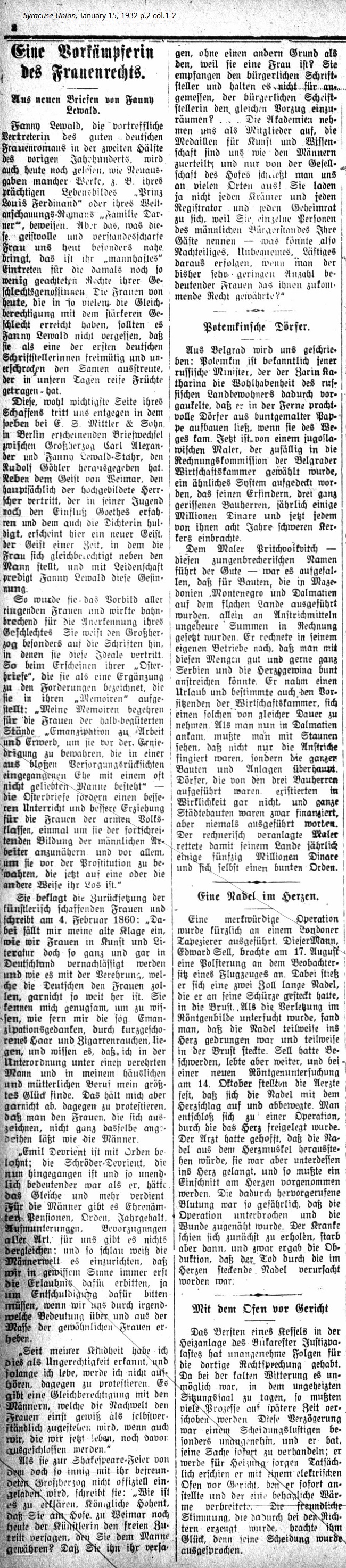 January 15, 1932 page 2 _____ From New Letters by Fanny Lewald Fanny Lewald, the splendid representative of the good German women's novel in the second half of the previous century, is still read today, as indicated by new editions of several works, such as the superb life story of Prince Louis Ferdinand or her novel, which takes a look at the world through the eyes of the Darner Family. But what draws us closer to this intelligent and insightful woman today is her "manly" approach to the seldom recognized rights of her female contemporaries. Women of today, who have gained so many equal rights as their stronger counterpart, should not forget Fanny Lewald. She was one of the first German woman authors to straightforwardly and dauntlessly sow the seeds which have yielded ripe fruit in our lifetime. What might be the most important of her creations we now have in a set of correspondence between Grand Duke Carl Alexander and Fanny Lewald-Stahr published in Berlin by E.S. Mittler & Sohn and compiled by Rudolf Göhler. Along with the spirit of Weimar, as represented primarily by the highly educated sovereign who also experienced the influence of Goethe and to which Lewald paid tribute, we have here a new spirit, a spirit of the age in which women placed themselves on equal footing with men. Fanny Lewald passionately preached this sentiment. Thus she became the model for all struggling women and she became a pioneer for the recognition of her sex. She pointed out to the Grand Duke those writings in which she advocated these ideals. With the publication of her "Easter Letter," which she called a supplement to the claims she had set down in her memoires: "My memoires seek the semi-affluent status of women; 'the emancipation to work and earn in order to save herself from humiliation which exists in a marriage often entered into with a man one doesn't love because of the need for financial support.' The Easter Letter demands better training and better education for women of the lower classes so they may approach the educational level of male workers, and prevent prostitution, which sooner or later leads to their undoing." She laments the neglect of artistic women and writes on February 4, 1860: "I'm recalling my old complaint, how we women in the arts and literature are so completely dismissed in Germany and how it reflects the German's veneration of women, as far as it goes. You understand me well enough to know how little I entertain emancipation thoughts regarding short haircuts and cigarette smoking. I find my greatest happiness as a subordinate to a respected husband and in my domestic and motherly vocation. But I do protest that women, who have distinguished themselves, are not granted the same respect as men. "Emil Devrient was awarded a medal; Wilhelmine Schröder-Devrient, who is now departed and yet so much more important as he, deserved a similar award and so much more. For men there are honorary offices, pensions, awards, yearly salaries, encouragements and privileges of all kinds. For us there's nothing similar. The world of men has been arranged so smartly that we women must always ask for permission, and indeed we must ask for pardon whenever we excel over and above the masses of average women. "Since childhood I have seen this as an injustice and as long as I live I will not cease to protest against it. There is equality with men which in the next world will certainly be seen as self-evident, even if we, who are alive now, are being excluded from it." When she wasn't officially invited to the Shakespeare Festival by her close friend, the Grand Duke, she wrote: "How can it be explained, Your Royal Highness, that today you deny a female artist entrance to the Court in Weimar, which you grant to men? You deny it for no other reason than because she is a woman. You receive middle-class male writers but consider it inappropriate to extend the same privilege to a middle-class female author?...The academies accept us as members; medals for the arts and sciences are given to us as well as men. Only the society of the Court excludes us in many areas! You invite every huckster and every file clerk because you call any person of the male pursuasion your guest — what could result in disadvantage, discomfort, or unpleasantness if one were to extend to a small number of important women the same courtesy?" Potemkin Villages _____ From Belgrade we receive this message: Potemkin is known as the Russian Minister, who fooled Tsarina Catherine into believing in the prosperity of rural Russian residents by having brightly painted cardboard villages constructed in the remote areas she was visiting. Now a Yugoslav painter, who incidentally happens to have been elected Accounts Commissioner of the Belgrade Chamber of Finance, has discovered a similar system whereby its inventors, three cunning building contractors, raked in several millions of Dinars annually and are now sentenced to eight years in prison. The painter, named Pritchvoikvitch — a tongue-twister of a name— noticed that buildings being constructed on flat land in Macedonia, Montenegro and Dalmatia accumulated incredibly high sums for paint and coating materials. Based on this own occupation he figured with this amount of materials one could colorfully paint all of Serbia and Herzegovina. He went on leave and had the presiding Chamber of Finance take one of similar duration. As they arrived in Dalmatia they looked in astonishment because not only was the paint lacking, the buildings and equipment were also absent. The villages supposedly built by the three contractors did not exist in reality. The civil construction project had been financed but never executed. Thus the account-savvy painter saved his country some fifty million dinars annually and netted himself a colorful medal. A Needle in the Heart _____ A remarkable operation was recently performed on a London paperhanger. The man, Edward Sell, installed upholstery to an aircraft obs