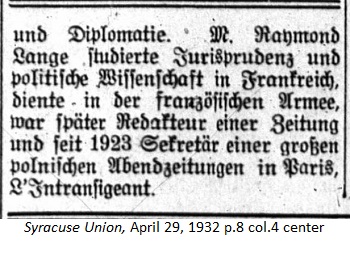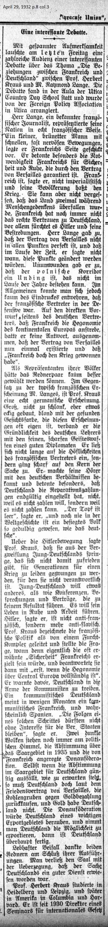 April 29, 1932 page 8 _____ Last Friday a large audience listened with rapt attention to an interesting debate on the theme, "The Relations between France and Germany" between Prof. Herbert Kraus and M. Raymond Lange. The debate took place in the auditorium of the Utica Country Day School and was arranged by the Foreign Policy Association in Utica. Mr. Lange, a well-known French journalist, represented his nation in true French fashion. A small, dark-haired man with quick, almost nervous movements, skillfully laid out France's position. He emphasized France's need for security and peace, which was guaranteed by the Versailles Treaty. France is, he stated, not imperialistic and its people hate war. However it cannot forget that the country was invaded twice in recent memory, France still can't put its trust in German, and above all else it fears Hitler and his aspirations. Mr. Lange admitted that the Versailles Treaty is not perfect on all points and that in the course of time, but he didn't say when, those points would be altered. In a straightforward manner he conceded that the Polish Corridor is an absurdity, which cannot survive over the the course of the years. In general one could scarcely ignore the impression that the French representative was on the defensive. At the direct accusation by the German representative that France was working towards continental European dominance, Lange had no answer except that the Versailles Treaty existed and that "France had won the war." As representatives for their people the speakers could not have been better chosen. Compared to the typical French appearance of Monsieur Lange, Prof. Krause is truly germanic in appearance. Large, not too slim, somewhat angularly built, blond with distinctive and healthy face coloration, he exemplified the properties of the German teacher with the fine intellectual acuity of a good diplomat. He did not spend much time on the courteous points raised by the French representative, but instead went quickly to the heart of the matter. He made his audience aware of the German issues and emphasized that Germany had finally discontinued reparation payments not because it did not want to pay them but because it could not pay them. "The pot is empty," he said, "and nowhere else in world history has a defeated people been as patient as the Germans." Concerning the Hitler Movement Prof. Kraus said that it arises from young Germany's exasperation and dissatisfaction that war forces generations to suffer for events for which they were not responsible. Young Germany wants something other than conferences, discussions and lectures which produce no results. It wants to live in peace and to have work. Hitler, he said, is not anti-French, he's more anti-Slavic. Prof. Krause described French politics as the development of a fear complex and posed the question, when the often mentioned "security" of France will be attained, then answered his own question with "once hegenomy over Central Europe is achieved." He warned this could drive Germany into the arms of the Communists. A Communist Germany would lead to a Communist France in a few months, and then probably spread to Spain. "The consequences of such an event would not remain without interest for the United States," he stated. Two dark clouds are always present on the political horizon, the referendum on the Saar region in 1935 and the Danube Federation suggested by France. Even if the Saar Referendum goes in favor of Germany, as expected, then according to the Versailles Treaty Germany must buy back the coal mines in gold. Germany doesn't have any gold. The Danube Federation would rob Gemany of an important export zone and take away Germany's possibility of exporting goods. In that case Germany would be finished. Lively applause thanked both speakers at the conclusion of their debate. People left the hall with the conviction that the German's position had been well served. Prof. Kraus studied in Heidelberg and Leipzig, and later in America at Columbia and Harvard. Since 1930 he has been director of a seminar for international law and diplomacy. M. Raymond studied jurisprudence and political science in France, served in the French Army, later became editor of a newspaper and since 1923 has been Secretary of a large Polish evening newspaper in Paris, L'Intransigeant. |