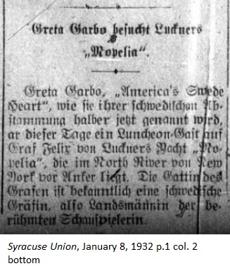 January 8, 1932 page 1 _____ Greta Garbo, "America's Swedish Heart" as she is called due to her Swedish heritage, was a luncheon guest today on Count Felix von Luckner's yacht "Mopelia", which lies at anchor on the North River in New York. The Count's wife is a Swedush countess and thus a compatriot of the famous actress. |