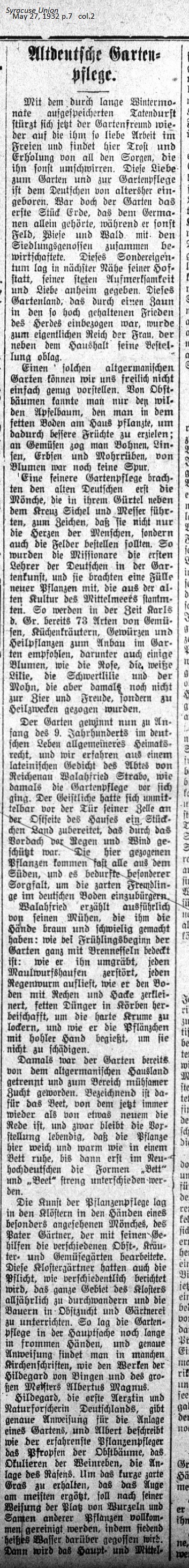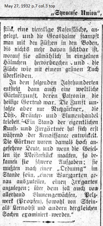 May 27, 1932 page 7 _____ We can't easily enough picture such an old germanic garden. The only fruit trees known back then were wild apple trees, which were planted in the fertile soil near the house in order to obtain better fruit. For vegetables beans, lentils, peas and carrots were planted. There were no flowers. More refined gardening techniques were first brought to the old Germans by the monks, who carried a sickle and knife along with their crucifixes in their belts as a sign that they were supposed to care for not only the heart of humanity but also the fields. Thus the missionaries became the first teachers of gardening to the Germans. They also brought an abundance of new plants with them which originated in the old cultures of the Mediterranean. In the time of Charlemagne there were already 73 varieties of vegetables, kitchen herbs, spices and healing plants recommended for stocking a garden along with some flowers like roses, white lilies, irises and poppies, at the time not used for decoration or special occasions but cultivated as healing aids. By the beginning of the 9th century the garden became a mainstay in German life and we learn from a Latin poem by the Abbot of Reichenau, Walafried Strabo, how he tended his own garden. The cleric had prepared a small plot of land in front of the door to his cell on the east side of the house. An awning protected against rain and wind. Just about all the plants came from the south and it required extra care to adjust the tender strangers to German soil. Walafried discusses in detail his efforts, which made his hands brown and calloused: how at the beginning of spring the garden was covered in stinging nettles; how he dug them out; how he destroyed the moles and dispatched every earthworm; how he chopped up the soil with a rake and hoe; how he got baskets of manure to loosen the hard clumps; and how he watered the seedlings from his cupped hand so as not to injure them. Sometime later the garden was separated from the old germanic farmstead and carefully cultivated in its own domain. Distinctive in this era was the garden patch, Beet in German, about which something new was always being discussed. It's certain that concepts were vivid — plants should rest in a soft, warm place like a bed. In fact, only when New High German [circa 1650] developed did the words Beet and Bett, meaning bed, become distinctive from each other. The art of plant care resided in the monastery in the hands of a particularly esteemed monk called the Pater Gärtner (Father Gardener,) who along with his assistants worked with the various fruit, herb, and vegetable gardens. The monastery gardener had the added duty, as was frequently reported, of wandering through the entire region around the monastery throughout the year and training the farmers in fruit cultivation and gardening. For a long time garden care rested primarily in pious hands and one finds exact instructions in many church works such as those of Hildegard von Bingen and the great master, Albertus Magnus. Hildegard, Germany's first female physician and natural scientist, gave full instructions for the layout of a garden and like the most experienced planter, Albert described how to graft fruit trees and grape vines and plant grass. In order to get short, tender grass which is most pleasing to the eye, one must, according to his instructions, completely remove all the roots and seeds of other plants by drenching the area in boiling hot water. Then the main and middle sections are covered in square pieces of turf. The grass is stamped into the ground with the foot until it's not longer visible. This causes the individual blades to burst forth and cover the surface like a green cloth. In the following centuries there arose a lay garden guild, whose patron saint was St. Gertrude. However the guild was comprised only of kitchen gardnerers, who dealt in the fruit, herb, and flower trade. Artistic and decorative gardeners first arrived during the Renaissance. Gardeners were highly respected people and when the journeymen made their masterwork they received difficult assignments. According to a "regulation" they had to be capable of planting a root garden and creating a labyrinth. Beyond this they were examined on flower propagation, grafting, stonefruit and other subjects. |