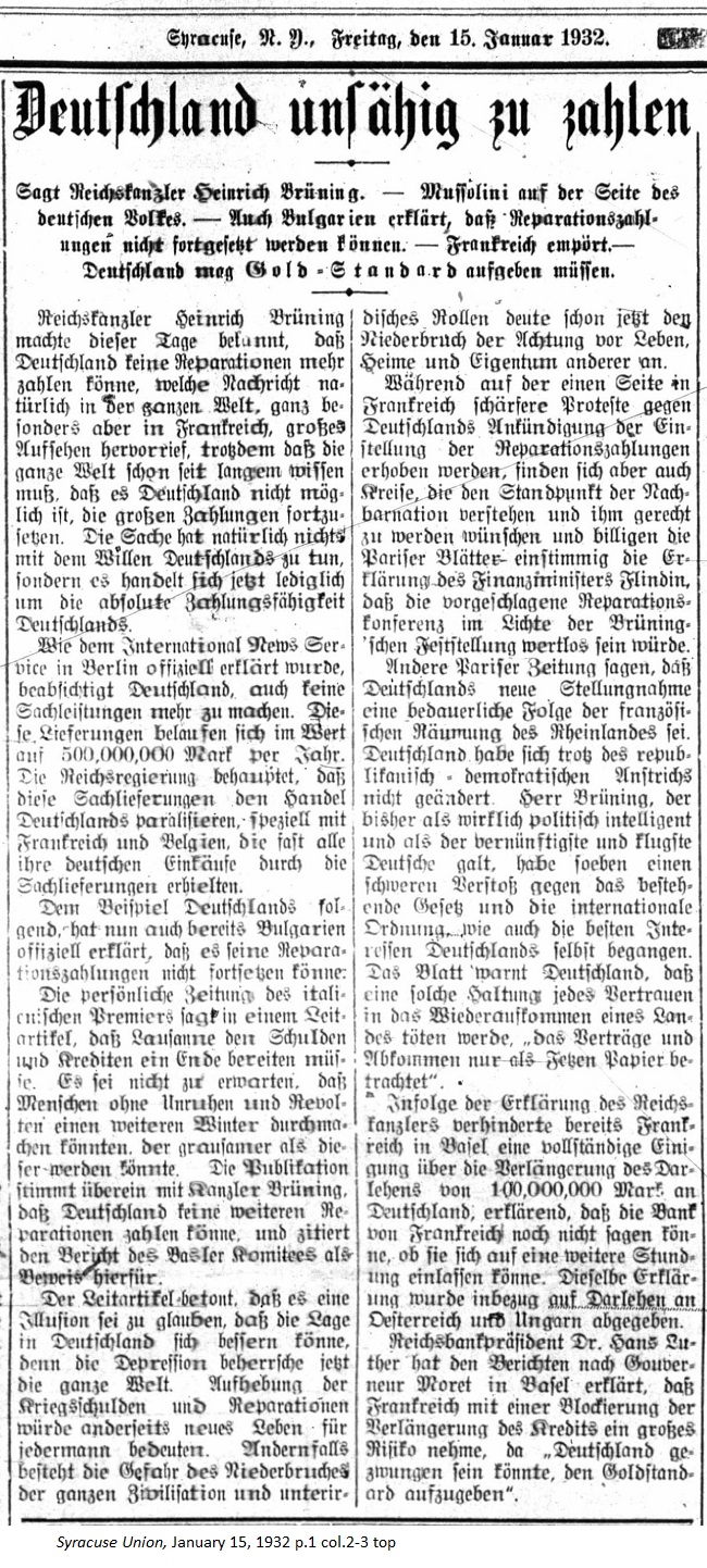 January 15, 1932 page 1 _____ Says Reichs Chancellor Heinrich Brüning — Mussolini on the Side of the German People — Bulgaria also declares that Reparation Payments cannot continue — France appalled — Germany might have to give up the Gold Standard. _____ Reichs Chancellor Heinrich Brüning announced today that Germany can no longer pay war reparations. This is naturally unprecedented throughout the world but in France it's created quite a furof even though the whole world has known for a long time that it's impossible for Germany to continue making these huge payments. Naturally it has nothing to do with Germany's willingness; rather it deals with Germany's absolute inability. As officially announced by the International News Service in Berlin, Germany no longer intends to make non-cash payments, which amounted to 500,000,000 Marks per year. The Reichs government contends that these non-cash payments have paralized Germany's trade, especially with France and Belgium, which obtain all of their German good through non-cash transactions. Following Germany's example, Bulgaria is ready to officially declare that it cannot continue making reparation payments. The personal newspaper of Italy's Premier states in a lead article that Lausanne must prepare to end the debits and credits. It's anticipated that people will not last through another winter without rioting and revolting, which would make matters worse. The publication agrees overall with Chancellor Brüning's statement that Germany cannot continue to make reparation payments and cites the report of the Basel Committee as proof. The lead article states it is dillusional to believe that Germany's situation will improve when the Depression reigns throughout the world. Cancelling war debts and reparations would mean a new life for everyone. Otherwise there's the danger of collapse of civilization as a whole and underground tremors signalling the breakdown of regard for life, home, and property. While some of the French have launched vehement protest against Germany's announcement on reparation payments, there are other factions which understand their neighboring nation's position and want to be fair. The Parisian newspapers unanimously support Finance Minster Flindin's statement that the proposed reparations conference is made moot in light of Brüning's declaration. Another Parisian newspaper states that Germany's new stance is the regretable result of French occupation of the Rhineland. Despite the democratic and republican veneer Germany has not changed. Mr. Brüning, who until now was deemed a true political intellect and a reasonable and sage German, has committed a serious infraction of existent laws and the international order even if it's in the best interests of Germany. The newspaper cautions Germany that such conduct would kill any confidence in the reemergence of a nation, "which considers treaties and conventions so much scrap paper." As a result of the Reichs Chancellor's declaration, in Basel France has already prevented an extention on the loan of 100,000,000 Marks to Germany, stating that the Bank of France still could not say if it would agree to a further moratorium. The same statement was given regarding the loans to Austria and Hungary. Reichs Bank President Dr. Hans Luther responded to Govenor Moret in Basel that in France's blocking of the credit extention it risked "Germany's being forced to abandon the Gold Standard." |
