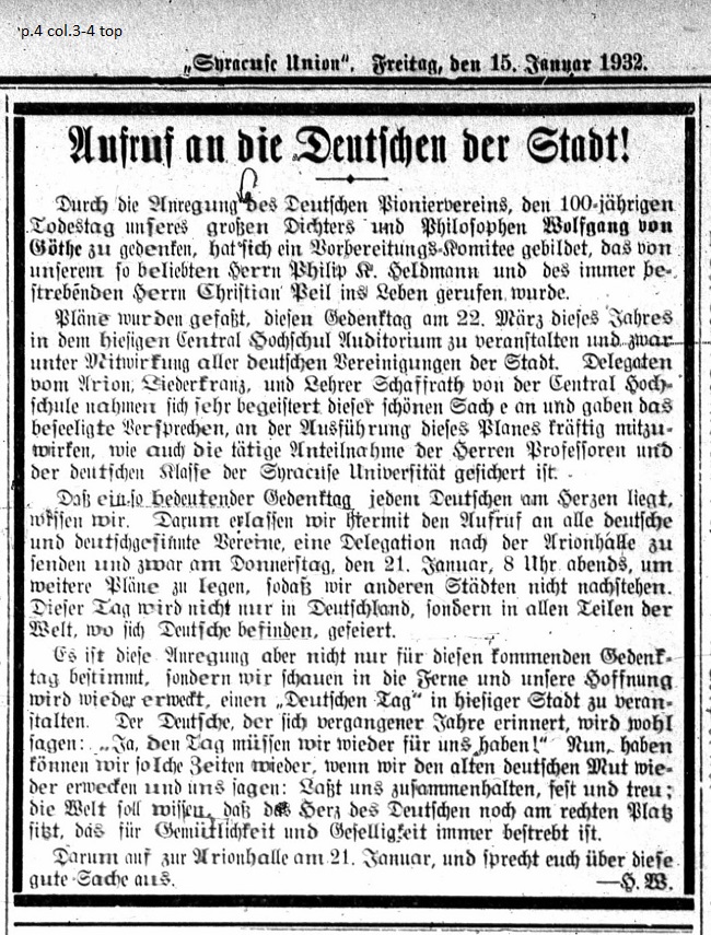 January 15, 1932 page 4 _____ At the suggestion of the German Pioneer Society a planning committee has been formed to commemorate the 100 year death date of our great poet and philosopher Wolfgang von Goethe. Our beloved Mr. Philip K. Heldmann and the ever-striving Mr. Christian Peil initiated the call for a committee. Plans have been made to hold this commemorative celebration on March 22nd of this year in the Central High School Auditorium. All the German organizations in the city will be participating. Delegates from Arion, Liederkranz, and Teacher Schaffrath of the Central High School have taken up this beautiful task with great enthusiasm and have given their solemn promises to vigorously work on an execution of the plan. Active participation by the professors and German classes of Syracuse University has been assured. We know that such a significant day of remembrance lies at in the heart of every German. For this reason we hereby issue a call to all German and German-minded societies to send a delegation to Arion Hall on Thursday, January 21st at 8 PM to set forth further plans so we do not lag behind any other cities. This day will not just be celebrated in Germany but in all parts of the world where you find Germans. The suggestion is not limited to the upcoming commemoration day but awakens a hope for the future that we might reinstitute a German Day celebration in our city. Germans who remember years gone by will certainly exclaim, "Yes, we must once again have a German Day celebration!" We can regain those good old days if we reawaken the old German courage and say, Let's get together, strong and true; the world should know that the heart of the German people is in its right place, forever striving for congeniality and sociability. Come to Arion Hall on January 21st and let's discuss this fine idea.