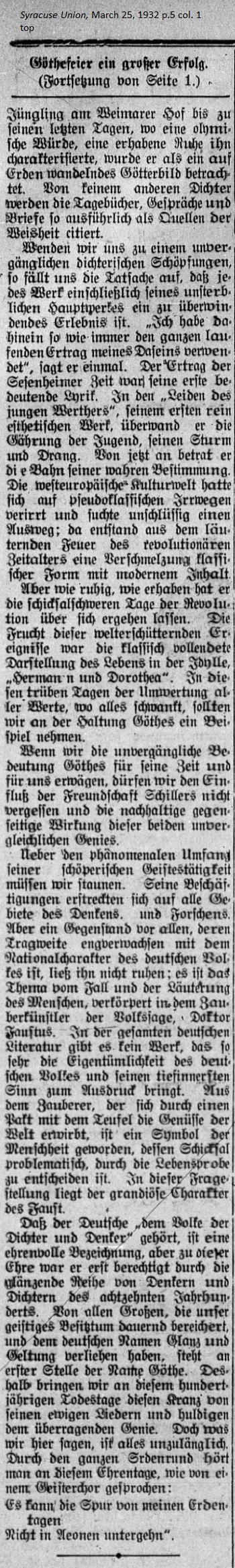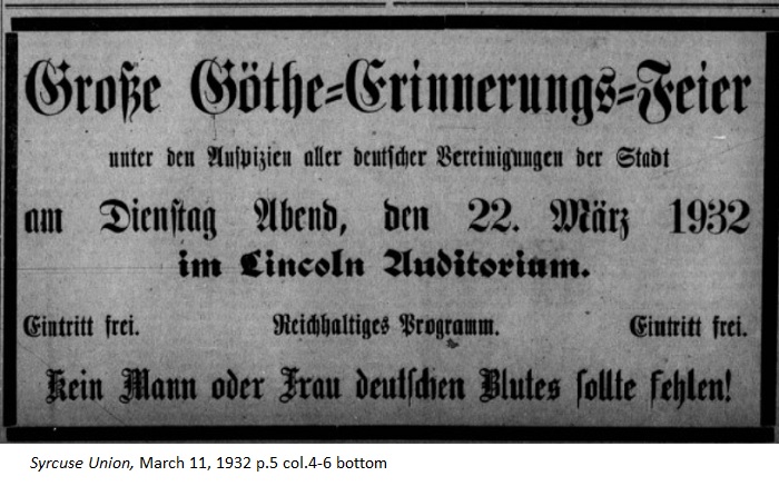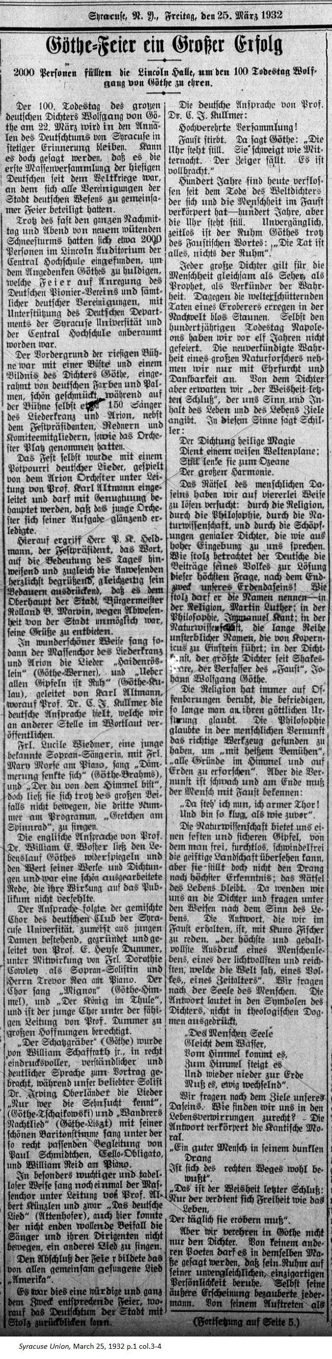 March 25, 1932 page 1 _____ 2000 People filled Lincoln Hall to Commemorate the 100th Death Date of Wolfgang von Goethe _____ Despite the recent snowstorm, which practically lasted all afternoon and evening, around 2000 people gathered in the Lincoln Auditorium of the Central High School to pay tribute to Goethe's memory. It was a celebration suggested by the German Pioneer Association and the all the city's German organizations, supported by the German Department of Syracuse University, and held at the Central High School. The foreground of the giant stage was beautifully decorated with a bust and portrait of the poet Goethe framed in German paints and palms. On the stage itself were 150 singers from the Liederkranz and Arion singing societies along with the festival president, speakers, and committee members plus the orchestra. The festivities included a potpourri of German songs, accompanied by the Arion Orchestra under the direction of Prof. Karl Altmann. Let it happily be noted that the young orchestra executed its assignment brilliantly. Afterwards Festival President P.K. Heldmann delivered a few words on the meaning of the day and heartily greeted all those present while also expressing his regrets that the mayor of the city, Rolland B. Marvin, was absent from the city and unable to offer his greetings. Then the group choir of the Liederkranz and Arion beautifully performed the songs "Haidenröslein (Goethe-Werner) and "Ueber allen Gipfeln ist Ruh" (Goethe-Kulau) conducted by Karl Altmann. Thereafter Prof. C.J. Kullmer gave a German language speech, the text of which we publish in a separate section. Miss Lucile Wiedmer, a young, well-known soprano, with Miss Mary Morse at the piano, sang "Dämmerung senkte sich" (Goethe-Brahms), and "Der du von dem Himmel bist". Despite the thundering applause she did not move until she performed the last song, "Gretchen an Spinnrad." The English language speech by Prof. Dr. William E. Wosher focused on Goethe's life and the value of his prose and poetry. It was a beautifully prepared address which did not fail to impress the audience. After the speech the mixed choir of the German Club of Syracuse University performed. The choir was comprised mostly by young women. It was established and conducted by Prof. W. Heyse Dummer with the participation of Miss Dorothie Cowley as soprano soloist and Mr. Trevor Rea at the piano. The choir sang from the opera "Mignon" (from the poem by Goethe, music by Himmel) and "Der König im Thule." Under the capable baton of Prof. Dummer the young choir exhibits great promise. "Der Schatzgräber" (Goethe) was recited by William Schaffrath Jr. in the German language in an expressive and clear manner then our beloved soloist, Dr. Irving Oberländer, sang the songs "Nur wer die Sehnsucht kennt" (Goethe-Tchaikowsky) and "Wanderers Nachtlied" (Goethe-Liszt) in his fine baritone voice accompanied by Paul Schmidtchen on the cello-obligato and William Reid at the piano. In an especially stunning and flawless rendition the group choir sang again under the direction of Prof. Albert Künzlen "Das deutsche Lied" (Attenhofer). Once again the unending applause prompted the singers and their conductor to sing another song. The conclusion of the celebration led to the song "America" sung by all. It was a a worthy and appropriate celebration upon which the German community of this city can look back with pride. The German address by Prof. Dr. C.J. Kullmer: Honored Assembly! Faust dies. Then Goethe says: "Time stands still. It's as silent as midnight. The clock stops. It is completed." A hundred years have flown by since the death of the world-poet, who epitomized himself and humanity in Faust — a hundred years, but time stands still. Goethe's fame is everlasting, timeless despite the Faustian words, "The deed is everything; fame is nothing." Every great poet works for humanity in a manner similar to the seer, the prophet, the herald of truth. Earth-shattering deeds of the conquerer merely elicit amazement in the next world. We didn't even celebrate the hundredth year anniversary death date of Napoleon eleven years ago. We accept the newly pronounced truth of a great researcher of nature with respect and gratitude. However from the poet we await "the ultimate conclusion of wisdom," which delivers us the sense and substance of life and its goal. In this vein Schiller speaks: The sacred magic of poetry