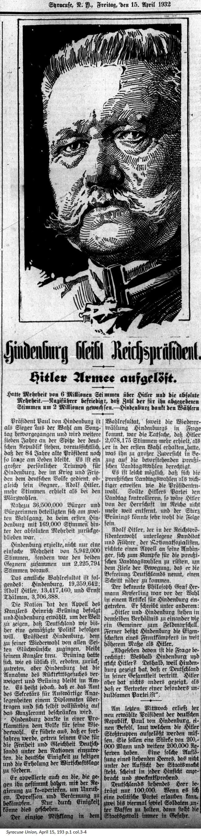 April 15, 1932 page 1 _____ Hitler Army Disbanded _____ A Majority of 6 Million Votes over Hitler and the Absolute Majority — Nazi Leader pleased that the Number of Votes increased by about 2 Million — Hindenburg thanks the Voters _____ President Paul von Hindenburg is the victor of the Sunday election and will stand as head of the German Republic for another 7 years, provided the 84 year old President remains alive that long. It is a great personal triumph for Hindenburg, who served the German people in war and peace, although his opponent, Adolf Hitler, received more votes than during the March election. Nearly 36,500,000 male and female German citizens participated in the second election. In the first election Hindenburg was 169,000 votes shy of an absolute majority. Hindenburg received not just a simple majority of 5,942,000 votes, but he was ahead of his two opponents combined by around 2,225,794 votes. The official election results are as follows: Hindenburg, 19,359,642; Adolf Hitler, 13,417,460; Ernst Thälman, 3,706,460. The Nation followed the appeal of Chancellor Heinrich Brüning and elected Hindenburg in order to show the world that Germany will continue in the moderate Party line. President von Hindenburg, who received congratulations from all sides, remains loyal to his Chancellor. As usual, Brüning offered to resign but Hindenburg refused the resignation attempt and Brüning remains in office. This means that he will transfer the office of Secretary for Foreign Affairs to a diplomat and limit himself to the position of Chancellor. In a proclamation to the people Hindenburg thanked them for his reelection. He explained that he will continue to be true to his oath and advocate for the freedom and equality of Germany among nations, secure German unity, and work towards economic recovery. He also issued an appeal to those who had voted against him to cooperate with the government in order to fight against unrest, depression and poverty. Only through unity can these things improve. A few notes of discord in the election results which call Hindenburg's relection into question involve the fact that Hitler received 2,078,175 more votes than he got in the first election, which entitles him to feel more confident with regard to forthcoming Prussian regional elections. It's easily possible that the Prussian parlimentary elections may prove more important than the presidential election. Should Hitler's Party control the parliament, then Hitler would not be far away from dominance in the Reich and the fall of Brüning could be in question. Adolf Hitler, the defeated presidential candidate and leader of the National Socialists, directed an appeal to his adherents to prepare themselves for the upcoming battle in the Prussian parliamentary election, which would take them a step closer to the Movement's ultimate goal, which he called the liberation of Germany. The famous philosopher, Count Hermann Keyserling, submitted a pro-Hindenburg article before the election. Among other things he wrote: "Hitler and Hindenburg stand in the same relationship to each other as a private stands to a field marshal. Furthermore, Hindenburg possesses the character of a front line fighter to a much higher degree than Hitler." "Apart from this, the question becomes: Why Hindenburg and not Hitler? Because Hindenburg has demonstrated that he represents Germany in its entirety. Hitler has demonstrated that he is the representative of a particularly intolerant Party." Germany's standing army only has 100,000 men. When a political party is allowed to have two to four times as many weaponed soldiers, then the the authority of the State is in jeopardy. |