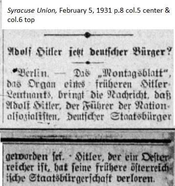 February 5, 1932 page 8 _____ Berlin. — The Montagblatt, the organ of a previous Hitler lieutenant, brings th report that Adolf Hitler, the leader of the National Socialists, has become a German citizen. Hitler, who is an Austrian, lost his previous Austrian citizenship. [June 1925] |