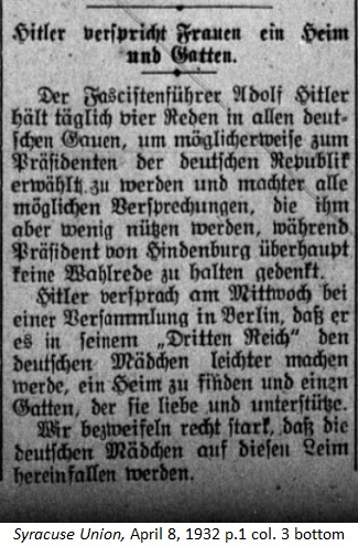 April 8, 1932 page 1 _____ The Fascist leader, Adolf Hitler, conducts four speeches daily in all German regions in order to enhance his chances to become President of the German Republic. He also makes all possible kinds of promises, which are of little use to him, while President von Hindenburg doesn't hold any election speeches. On Wednesday Hitler promised at an assembly in Berlin that he will make life easier for German girls in his "Third Reich" to find a home and a husband whom she will love and support. We strongly doubt that the German girls will fall for this line. |