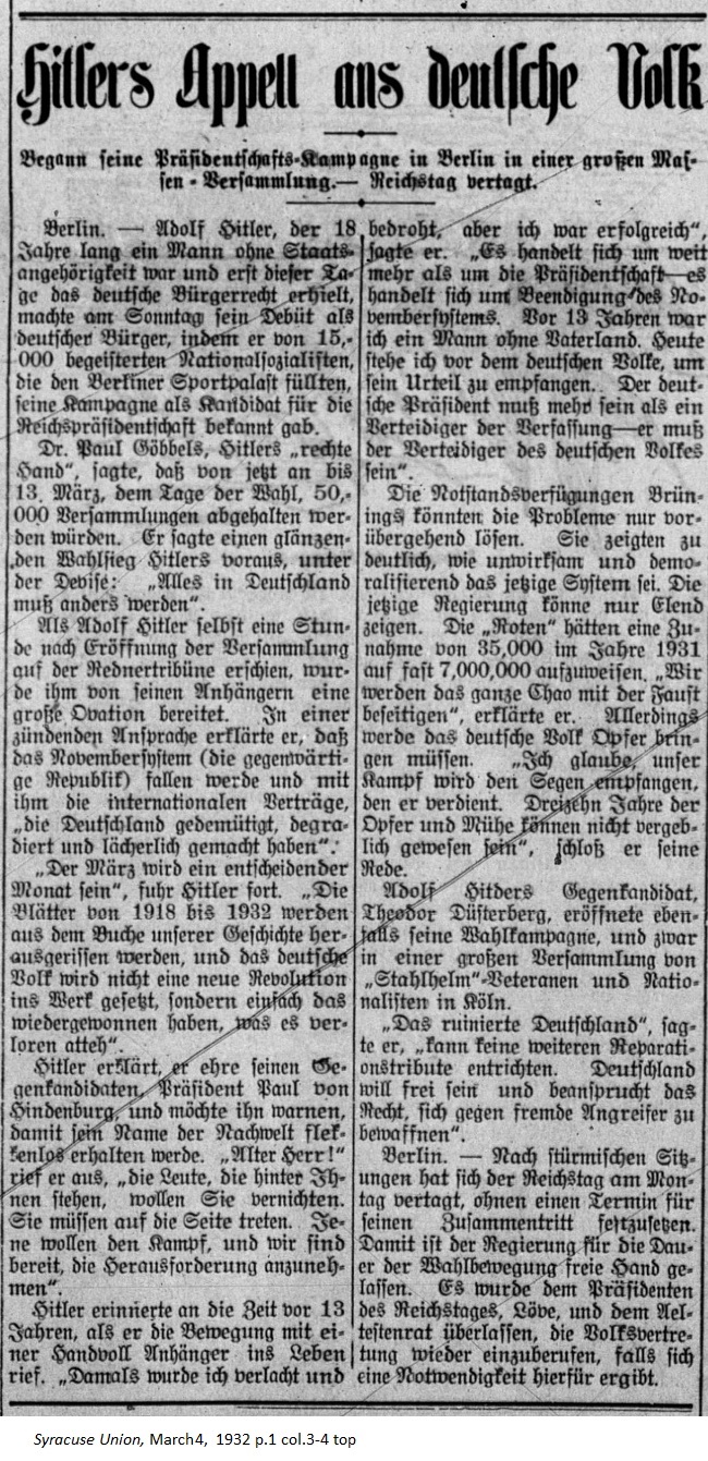 March 4, 1932 page 1 _____ His Presidential Campaign in Berlin began with a Huge Mass Assembly — Reichstag in Session _____ Berlin. — Adolf Hitler, who was a man without citizenship for 18 years and just a few days ago received his German citizenship, made his debut on Sunday as a German citizen, filling the Berlin Sports Arena with 15,000 enthusiastic National Socialists and announcing his campaign as a candidate for the Reichs presidency. Dr. Paul Göbbels, Hitler's "right hand" said that from now until March 13th, the day of the election, 50,000 assemblies will be held. He forecast a stunning election victory for Hitler under the slogan, "Everything in German must be changed." When Adolf Hitler himself appeared on the platform an hour after the assembly opened, he received a resounding ovation from his followers. In a rousing speech he declared that the November System (the current Republic) will fall and with it the international treaties "which have humiliated and degradated Germany and turned it into a laughing stock." "March will be a decisive month," Hitler continued. "The pages of our history book from 1918 to 1932 will be torn out and the German people will not only set a new revolution in motion but win back everything that was lost." Hitler stated he respects his opposition candidate, President Paul von Hindenburg, and wishes to advise him to keep his reputation spotless for posterity. "Elder Gentleman!" he shouted, "the people who stand behind you, want to ruin you. You must step aside. Everyone wants a fight, and we are ready to accept the challenge." Hitler thought back to the time 13 years ago when he called the movement into life with a handful of followers. "Back then I was laughed at and threatened, but I was successful," he said. "It concerned much more than the presidency — it dealt with the conclusion of the Novembe System. Thirteen years ago I was a man without a fatherland. Today I stand before the German people to receive their verdict. The German president must be more than the defender of the constitution — he must be the defender of the German people." Brüning's contingency regulations cane solve the problems only temporarily. They clearly show how ineffective and demoralizing the current System is. The current goverment can only display misery. The "Reds" exhibited an increase from 35,000 in 1931 to almost 7,000,000. "We will obliterate the chaos with our fists," he declared. Certainly the German people must bring sacrifices. "I believe, our fight will be blessed. It deserves that. Thirteen years of sacrifice and effort cannot be for nothing." With this he closed his speech. Hitler's opposition candidate, Theodor Düsterberg began his campaign at the same time in Cologne with a mass assembly of "Steel Helmet" veterans and Nationalists. "Germany is in ruins," he stated, "and can no longer pay reparation tributes. German wants to be free and demands the right to arm itself against aggressors." Berlin. — After stormy sessions the Reichstag adjourned on Monday without setting any date to reconvene. Thus the government is allowed a free hand for the duration of the election process. It was left to the President of the Reichstag, Löve, and the Elder Council to call back the people's representatives in the event there is a need. |