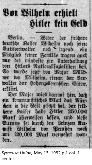 May 13, 1932 page 1 _____ Berlin. — Neither the former German Kaiser nor his estate manager nor any member of his family have contributed in the least to the support of Hitler's National Socialists. This was recently announced by Major Müldner von Müheim, one of the administrators of the Hohenzollern Estates. The Major indicated that a Communist newspaper had issued this fairytale to the world in a report stating that the former Kaiser may have transferred 250,000 Marks to Hitler and that this sum may have been increased by another 220,000 Marks by Prince August Wilhelm of Prussia. |