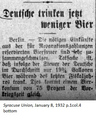 January 8, 1932 _____ Berlin. — The revenue from the Beer Tax required to offset a portion of reparation payments has greatly diminished. The fact is, due to the tax Germans only drank an average of 19 ¾ gallons during the fiscal year. This is only 75% of the beer consumed in the prewar years. |