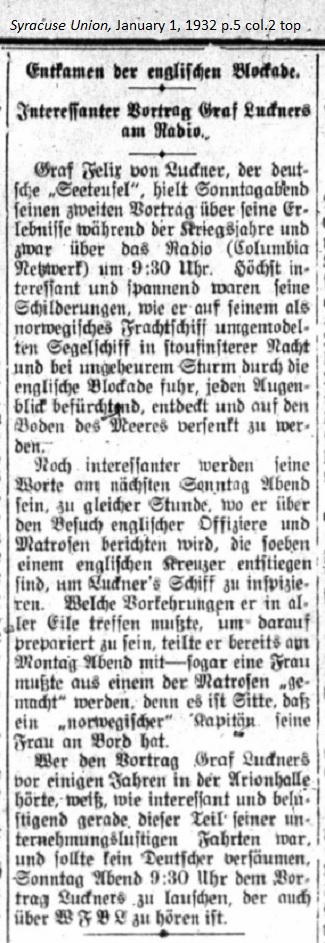 January 1, 1932 page 5 _____ On Sunday evening Count Felix von Luckner, the German "Sea Devil," delivered his second lecture on his experiences during the war years on the Columbia Radio Network at 9:30 PM. His description of how he sailed through the English Blockade in his ship, which was camouflaged to look like a Norwegian freighter, in the dead of night and during a huge storm was highly interesting and exciting. He feared that at any moment he might be discovered and sunk to the bottom of the sea. Still more interesting will be his program next Sunday evening at the same time, when he will report on the visit of English officers and sailors, who alighted from an English cruiser in order to inspect Luckner's ship. On Monday evening he described what precautions he had to take in great haste in order to prepare for the boarding. One sailor had to be disguised as a woman because it was the custom of "Norwegian"captains to have their wives onboard. Anyone who heard Count Luckner's lecture a few years ago in Arion Hall knows how interesting and amusing this part of his adventurous voyage was, and no German should miss Luckner's lecture Sunday evening at 9:30 P.M., which can be heard on Station W.F.B.L. |