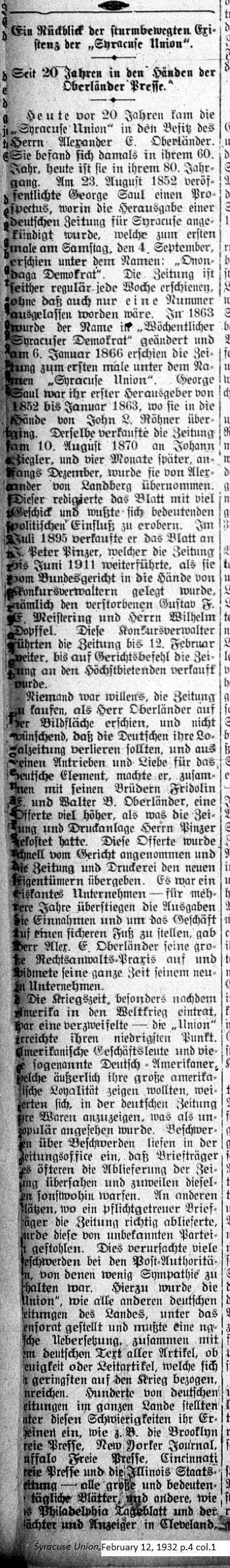 February 12, 1932 page 4 _____ Since It's Been in the Hands of the Oberländer Press for 20 Years _____ 20 years ago today the Syracuse Union became the property of Mr. Alexander E. Oberländer. It had been in existence for 60 years and today also marks its 80th year. On August 23, 1852 George Saul published a prospectus in which the publication of a German newspaper for Syracuse was announced. The first issue was published on September 4th under name Onondaga Demokrat. Since then the newspaper has appeared regularly every week with only one issue missing. In 1863 the name was changed to Wöchentlicher Syracuser Demokrat (Weekly Syracuse Democrat) and on January 6, 1866 the newspaper appeared for the first time under the name Syracuse Union. George Saul was the first publisher from 1852 to January 1863 when it passed into the hands of John L. Röhner, who sold the newspaper on August 10, 1870 to Johann Ziegler. Four months later at the begining of December it was taken over by Alexander von Landberg, who managed it with much skill, knowing how to win significant political influence. In July 1895 he sold the paper to J. Peter Pinzer, who carried it further until June 1911, when the Federal Court placed it in the hands of bankruptcy administrators, the late Gustav F.E. Meistering and Mr. Wilhelm Dopffel. They managed the paper until February 12th, when by court order tbe newspaper was put up for sale to the highest bidder. No one was willing to buy the newspaper when Mr. Oberländer came on the scene. No one wanted the Germans to lose their local newspaper. It was due to urging and love for the German element that he, along with his brothers Fridolin F. and Walter B. Oberländer, made an offer much higher than the price it had cost Mr. Pinzer for the newspaper and the print equipment. The offer was quickly accepted by the Court and the newspaper and printshop was turned over to its new owners. It was a risky enterprise — for many years expenses outnumbered income. To put the business on secure footing Mr. Alex E. Oberländer gave up his large attorney practice and dedicated all his time to the new enterprise. The war years, especially after America entered the World War, were a dubious time — the Union sunk to its lowest point. American business people and many so-called German-Americans, who openly wished to display their great loyalty to America, refused to advertise their wares in the German newspaper, because it was viewed as unpopular. Complaint after complaint was filed at the newspaper office that letter carriers often overlooked the delivery of the newspaper and occasionally tossed it who-knows-where. In other places where duty-conscious letter carriers correctly delivered the newspapers, they were stolen by unknown parties. This created many complaints to the postal authorities, from whom little sympathy was received. In addition the Union, like so many other German newspapers in this country, were placed under the supervision of the Censureship Office. English translations had to be supplied with the German text of all articles, be it news or lead article, having the slightest to do with the War. Hundreds of German newspapers throughout the country had to adjust to these complex stipulations, including The Brooklyn Freie Presse, New Yorker Journal, Buffalo Freie Presse, Cincinnati Freie Presse, and the Illinois Staatszeitung — all large and significant daily newspapers. [Scroll down for column 2 of this article] |