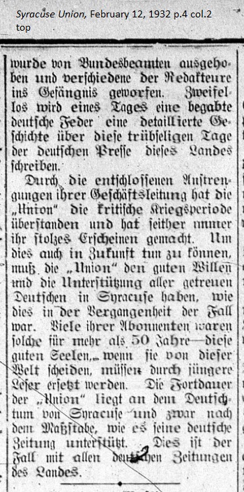 February 12, 1932 page 4 column 2 Others such as Philadelphia Tageblatt and Der Wächter und Anzeiger in Cleveland were confiscated by Federal officials and various editors were thrown in prison. Undoubtedly some day a gifted German feather will write a detailed history concerning these dismal days of the German press in this country. Through the determined efforts of the business management the Union survived the critical war years and continued to publish its proud issues. In order to continue to publish in the future, the Union must have the good will and the support of all loyal Germans in Syracuse, as was the case in the past. Many of its subscribers were loyal for more than 50 years — these good souls, when they departed this world, had to be replaced by younger readers. The continuation of the Union relies on the Germans of Syracuse to support its newspaper in full measure. This is the case for all German newspapers in this country. |