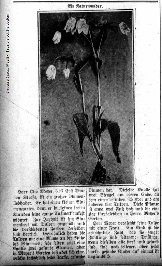 May 27, 1932 page 8 Mr. Meyer compares his tulip to a woman. One child is the usual number that she produces; twins are less frequent; triplets, when they're all strong and healthy, even rarer; but having six strong, healthy children at a time is unbelievable. |