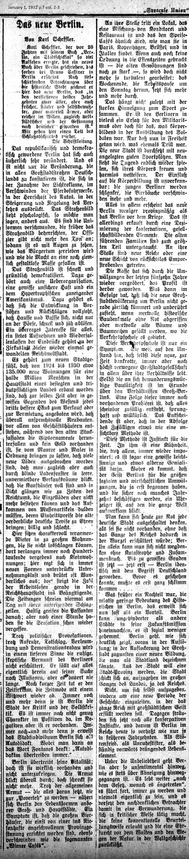 January 1, 1932 page 7 By Karl Scheffler. The Editorial Staff. Republican and Democratic Berlin has also changed outwardly. And it's not just the transformation all large city streets in Germany have encountered — the increase in neon signs, the disappearance of horse-drawn vehicles, the dominance of automobiles and the increase and regulation of traffic. Psychologically the streets' appearance, one might say, is different. Uniforms have disappeared, officers no longer set the tone, and one can see how the middle class is being crushed while the power of the seemingly faceless masses has fallen away. The streets' appearance is rapidly and fundamentally being democratized. Now there's a super-organization, an uncertain haste and a hypertrophic inclination towards Americanism. There's a rapid and sudden movement of advancement and setback, boom and bust, and it's not just in the stock market. There's an overexcited interest for all things, a constant digesting and expelling of sensations in a circus-like atmosphere in this transformed imperial world city. Between 1924 and 1930 the capital city in this vanquished and tribute-paying country has developed a new feel with an increase of 135,000 residences for half a million people while at the same time in certain sections of West Berlin every third "better" house has gone on sale or has been rented out. Overall there's sophisticated new construction built by housing companies while old stucco-facade houses have let their plaster ornamentation decay and fall. There's no money on hand to have walls and paint repaired. Many new shops have opened while at the same time display windows lie bare in empty, unrentable showrooms. Department stores are full of merchandise as lights gleam as if they were still in the time of superabundance while smaller shops can no longer subsist with the arrival of mass-produced goods, the unit pricing of which taint the old German motto of honor through quality workmanship; instead it's cheap and of poor quality. Here sit atypical and impoverished renters in large residences which they cannot sell off; over there sit hundreds of thousands hoping in vain for a small home. Here in ever new forms the repressed spirit of enterprise reigns and often produces surprising results. There the number of unemployed climbs at an alarming rate in the Empire's capital city. Four times a day the newspapers scream with their maddening headlines. Passersby hastily grab them, but after an hour they have already forgotten the sensationalism. Despite political provocations, despite upheaval, homicide, slander and the noise of demonstrations, in the deeper sense the quiet, sceptical reason of the Berliner remains unruffled. He looks at everything in his search for illusions, but it doesn't last long. After a short time he discounts the contemporary confusion with a joke. More than ever Berlin has become the city of criticism and self-critique. There's never enough of the positive but of the negative there's always enough at hand. More than ever the Berlin individual is an autodidact. One thinks on Fontane's words: "Autodidacts always go to excess." Berlin exaggerates its vitality, but it is there and it won't be subdued. Poverty is everywhere but it no longer frightens. Regarding the overall poverty — everyone does his utmost to prevent ever becoming impoverished — Berlin is approaching the level of poverty in other large and capital cities. One symptom is the disappearance of large beer halls, which once were built in gigantic, provincial fashion. The so-called "Vienna-style cafés" also have disappeared. In their place there's a local spot, a combination pastry shop and restaurant, similar to the cafés in Paris, Copenhagen, Brussels, and Italy. There are no set meal times — the old customs are far too rigid — the work pace is no longer as turbulent. More and more service occurs on weekends and during the day off on Sunday. Basically that coincides with the strong inclination towards sports activities. For many a Berliner it's a substitute for militarism or for physical training similar to that of the soldier. What once was compulsory drilling is now done voluntarily. The new city is well furnished with good sports facilities. One sees youth at play again, enjoying their bodies and engaging in harmless contests. The influence of physical training is obvious. Young Berliners are thinner; more and more the beer bellies are disappearing. All in all, the new Berlin seems less provincial than pre-war Berlin. That was achieved through the decimation of the conservative, social element. To a large extent the old leading families have disappeared and as a result the new, big-city population around Berlin didn't seem bothered or uncomfortable tearing down valuable historic memorials for no reason or felling priceless old trees and rows of trees whereever they cause traffic psychosis. Traffic psychosis is only one of the symptoms. It points to the fact that even this new, at time bankrupt, but always upwardly mobile big-city population lives beyond its means. Even the wonderous building activities essentially go beyond the means of Berlin at large. The result of this ostentatiousness is that everything appears to originate randomly, erratically, and haphazardly. However, the deciding factor is that in the array of random elements there is an invisible method. The method is instinct for the times. There's a boldness to it which, despite everything, always impresses. There's a certain frivolous yet silly ingenuity. Where does it come from, this Berlin mindset for great social and economic revolution, which once begun will take decades? It's the hands of a clock attentively looking at the entire world. If necessary, today one can consider every German city disconnected as though it were not there without the entire empire being shaken to its roots. Only in Berlin one cannot disgard the other cities without catastrophe and collapse. To a ce