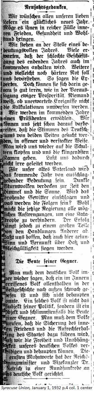 January 1, 1932 page 4 _____ We wish our beloved readers a Happy New Year. May it fill you with inner peace, and bring you good health and prosperity. We stand at the brink of a significant year. Many expect that the bad economy of the past year will persist into this year. Broader and perhaps even harsher need stands before us. So say the experts. Then again they may be in error just as they were in predicting eternal prosperity. No one knows if unexpected events will reverse their calculations. In the coming year we elect a president. We should prepare now in public and private ways to insure that the votes of the German community are being sought after by both sides. Once again they will slap us on the back and call us the most pleasant names. Let's not be misled by it. The coming year will have decisive meaning for the old fatherland. Dark storm clouds cover the sky and obscure the sun. Will threatening weather strike, and what will the results be? The current government is taking all possible measures to prevent catastrophe. But success relies to a great extent upon the actions of others. Let us hope that good sense and reason will prevail over hatred and apathy. The Spoils of His Enemies _____ One must constantly tell the Germans that throughout world history a people divided among itself appears outward weak and incapable of self-determination. Such a people is not the subject of its politics but its object, and in the worst case the spoils of his enemies. One must assure these people that the security of internal peace leads to the preservation of the state and that we must defend and maintain the freedom and independence of our German people. This serious warning to the German people was deliverd by the Reich's Finance Minister and Vice-Chancellor Dr. Dietrich during a radio address. |