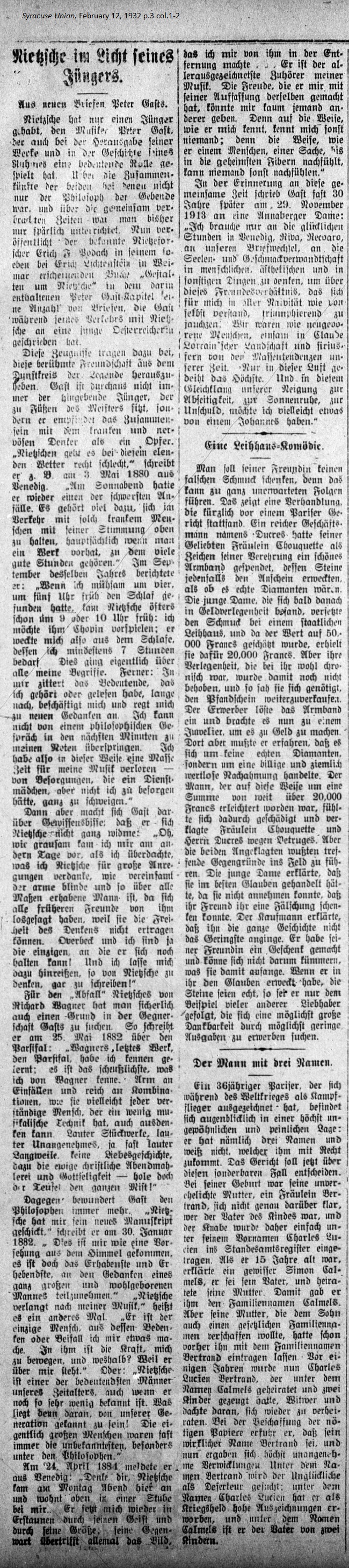 February 12, 1932 page 3 From Recent Letters by Peter Gast Nietzsche only had one disciple, the musician Peter Gast, who played an important role in the publication of his work and the history of his renown. One receives little insight from the meetings at which the philosopher was not just the host or about the times they spent together. The well-known Nietzsche researcher Erich F. Podach, in his book published by Erich Lichtenstein in Weimar titled Gestalten um Nietzsche, contains a chapter on Peter Gast and a number of letters which Gast wrote to a young Austrian woman during Gast's time together with Nietzsche. These testimonials contribute to lifting this famous friendship out of the realm of legend. Gast is definitely not always the devoted disciple sitting at the feet of the master, rather he feels his time together with the sick and nervous thinker is a sacrifice. "In this miserable weather things are not going well for Nietzsche," he wrote on May 3rd, 1880 from Venice. "On Saturday night he again had one of the most diffuclt attacks. It takes a lot to keep one's spirits up when dealing with such a sick man especially when one is planning a work which requires many good hours." In September of the same year he reported: "Whenever I had trouble getting to sleep around four or five AM, Nietzsche often came around 9 or 10 AM. I liked playing Chopin to him. He'd wake me up when I needed at least 7 hours sleep. It goes beyond my comprehension. Important things that I have heard or read vibrate through me; they occupy me and produce new thoughts in me. I can't jump from a philosophical discussion and in the next minute take up my music. In this way I have lost a massive amount of time for my music — by keeping quiet about an errand to which a maid, not I, should have to attend." However Gast then felt pangs of remorse for not devoting himself to Nietzsche: "Oh, how cruel I felt the other day when I thought about how indebted I was to Nietzsche for his many suggestions. How alone the poor blind man, who is elevated above the masses, feels when he rids himself of his former friends because they could not bear such freedom of thought. Overbeck and I are the only ones to whom he can relate! And I let myself get carried away thinking about Nietzsche that way, let alone writing it down!" Concerning the breech between Nietzsche and Richard Wagner one certainly had justification in researching Gast's antagonism. On May 25, 1882 he wrote concerning "Parsifal": "I've become acquainted with Wagner's latest work, Parsifal. It's the most atrocious thing I've heard from Wagner — poor in concepts and rich in combinations as they are perhaps concocted by reasonable men with little musical technique. Pure piecework, purely unpleasant, and rather boring; no romance or tale of the Last Supper and godliness. Send the whole mess off to the devil!" Then again Gast had ever greater admiration for the philsopher. "Nietzsche has sent me a new manuscript," he wrote on January 30, 1882. "For me it's an act of Providence coming down from heaven. It is the most sublime and uplifting of thought from one of the greatest and most well-form of men." "Nietzsche yearns for my music," he said another time. "He is the only person whose opinion or approval means something to me. He has the power to move me, but why? Because he stands above me." Or, "Nietzsche is one of the most significant man of our age, even if he is not so well known. What does it mean to be known by our generation? The truly great men were almost always unknown, especially among the philosophers." On April 24, 1884 he reported from Venice: "Consider this. Nietzscne arrived here on Monday evening and he lives in a room above me...He astonished me once again with his intellect and his greatness; his presence always exceeds the images I have of him from afar...He is the most distinguished audience for my music. His opinion of my music makes me happier than scarcely anyone else's ever could. He knows me like no other; the way with which he empathizes with a man or an issue, down to deepest fiber of his being, can never be equaled by anyone else." In his memoires concerning the same period Gast wrote almost 30 years later on November 29, 1913 to a lady from Annaberg: "I need only think back on the happy hours in Venice, Riva, and Recoaro in our exchange of letters to recall the spiritual and aesthetic kinship of this friendship, which I understood in all its simplicity and which caused me to cheer triumpantly. We were like newly-born men, alone in a Claude Lorraine landscape and a constellation away from the mass tendencies of our time. Only in these heavens were we granted the utmost. And in this harmony of our inclinations towards remoteness, towards sun filled peace, towards innocence, I might have had something of a St. John the Disciple moment." A Pawnshop Comedy _____ One should never give his girlfriend fake jewelry because it can have unexpected consequences. This is demonstrated in a recent case before the Parisian Court. A rich man named Dueres gave his beloved Miss Chouquette a beautiful bracelet as a sign of his affection. The bracelet's gemstones sparkled like real diamonds. The young woman, who found herself pressed for money, took the bracelet to a state pawnshop, where the value was set at 50,000 Francs. She received 20,000 Francs. But her financial difficulites were not resolved so she had to sell the pawn ticket. The buyer retrieved the bracelet and took it to a jeweler to sell it and recover his expenses. But he found out that the diamonds weren't real so he had a cheap and worthless replica. The man, who now had been relieved of well over 20,000 Francs, felt cheated and accused Miss Chouquette and Mr. Dueres of fraud. However the two accused filed excellent counterarguments. The young lady declared that she had acted in good faith since she assumed that her friend would not give her a fake. The merchant declared that he had nothing t