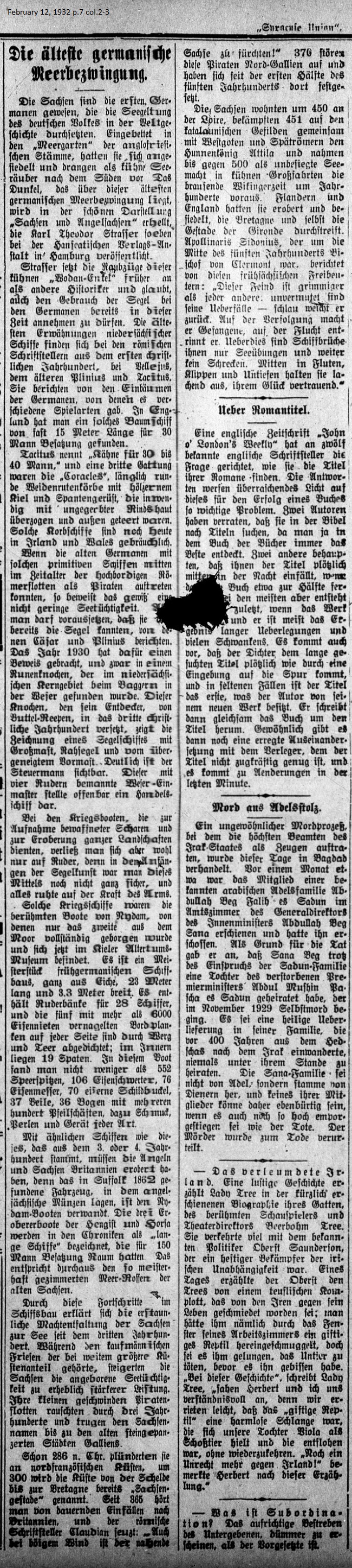 February 12, 1932 page 7 _____ The Saxons were the first seaworthy group among Germans in world history. Nestled among the people of the Anglo Frisian tribes, they established themselves as bold pirates in the south before the dark ages. The oldest German sea conquest is highlighted in the beautiful account titled Sachsen und Angelsachsen (Saxon and Anglo-Saxon) by Karl Theodor Strasser published by Hanseatische Verlags-Anstalt in Hamburg. Strasser places the piracy of these bold "Grandchildren of Odin" in an earlier era than other historians and believes that the Germans were already using sails at this time. The earliest mentions of Lower-Saxon ships are found among the Roman writers of the first century A.D., Velleius, Pliny the Elder and Tacitus. They described various kinds of dug-out canoes used by the Germans. In England such a wooden ship was found, almost 15 meters in length and able to transport 30 men. Tacitus spoke of "boats for 30 to 40 men" and a third type called coracles, oblong willow-branch baskets with wooden keel and framework and an interior covered in untanned cowhide and a tarred exterior. Such basket boats are still used today in Ireland and Wales. When the old Germans with their primitive ships entered Roman-controlled waters as pirates during the age of high-sided Roman flotillas they demonstrated a great deal of seaworthiness. One may suppose that they already knew about sails, as reported by Caesar and Pliny. Proof was found in 1930 from runes on bones which were found in the Lower Saxon central region during excavation of the Weser River. These bones, dated as belonging to the third century by their discoverer, Buttel-Reepen, show markings of a sailing ship with a large mast, square sail, and bent foremast. The navigator is clearly marked. This four-oar propelled, Weser, single masted boat apparently represents a trade vessel. The warships, which served to transport men with weapons to conquer entire regions, were powered by oars alone because in the beginning sails were not yet a completely reliable means of propulsion. Everything depended on the strength of human arms. Such war vessels were the famous boats of Nydam Mose, of which only the second was completely salvaged during the excavation of the bog, and is currently located at the Kiel Antiquities Museum. It is a masterpiece of early Germanic ship building, made entirely of oak, 23 meters long and 3.3 meters wide. It contains 28 stations for oarsmen and 5 wall planks per side nailed together with more than 6000 iron rivots and sealed with oakum and tar. The interior has 19 spars. No fewer than 552 spearheads, 106 iron swords, 76 iron knives, 70 shield bosses, 37 axes, 36 bows and many hundreds of arrows, plus jewels, pearls, and equipment of all kinds were found. Ships similar to the Nydam boats, which originated in the 3 or 4th century, must have invaded the Angles and the Saxons of Britain because a vessel was found in Suffolk in 1862 which contained Anglo-Saxon coins. The three conquest boats of Hengist and Horsa were described in the chronicles as "long ships," which had room for 150 men. This conforms to the masterfully carpentered "Seahorses" of the old Saxons. This progress in shipbuilding accounts for the astonishing display of seapower by the Saxons since the third century. While the merchantile Frisians belonged to the larger coastal areas, the Saxons increased their inborn sea prowess to much greater and stronger achievment. Their small, swift, pirate flotillas swept through the third century and carried the Saxon name all the way to the old, stone-fortified cities of Gaul. By 286 A.D. they plundered the coast of northern France. Around 300 the coastline from the Scheldt River to Brittany was called the "Saxon Shores." From 365 on one heard of recurring incursions into Britain and the Roman writer Claudian lamented: "And wherever the gusty wind blows, the approaching Saxon is to be feared." By 370 A.D. these pirates assailed northern Gaul and since the first half of the fifth century they have settled there. Around 450 the Saxons lived in the Loire region. In 451 they fought in the Catalonian fields along with the Visigoths and Late Romans against Attila, King of the Huns. Until around the end of 500 A.D. they were the undefeated seapower during the era of bold voyages by the Vikings. They invaded and settled in Flanders and England. They even wandered down to Brittany and the Gironde region. Apollinaris Sidonius, who around the middle of the fifth century was the bishop of Clermont, wrote about these early Saxon buccaneers, "This enemy is more fierce than any other. The raids are unexpected — prudently he retreats. During the foray he takes prisoners; when in flight, he escapes. Moreoever, shipwrecks are merely maritime exercises, nothing to fear. In the midst of floodwaters, cliffsides and shallows they smile, relying upon their luck." Novel Titles _____ An English periodical titled John o' London's Weekly asked twelve well-known English writers how they decided on the titles of their novels. The answers shed a surprising light on this important issue with regard to the success of their books. Two authors admitted that they looked for titles in the Bible since one always found the best titles there. Another two writers maintained that the titles occurred to them in the middle of the night when the books were about half way finished. However for most the title originated as the result of lengthy deliberation and much wavering back and forth once the work was complete. It also was revealed that the poet suddenly discovered the title like an inspiration out of the blue. In a few cases the title was the first thing that came to the author's mind for a new work. He writes the book after the title. Usually there's a heated discussion with the publisher that the title isn't sufficiently appealing and it's changed at the last minute. Death and the Pride of Nobility _____ An unusual murder trial t