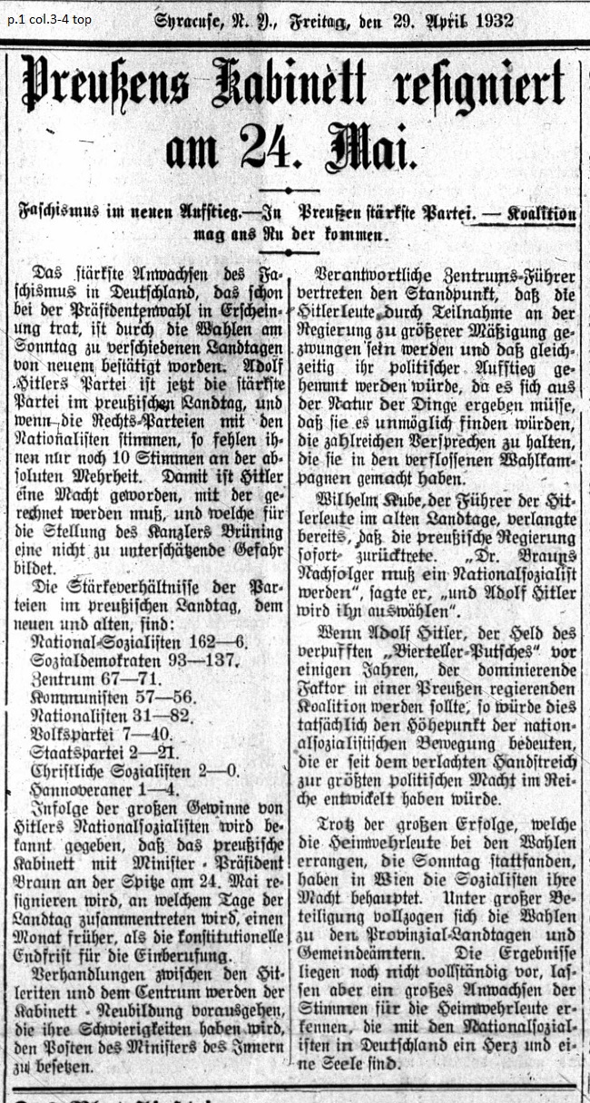 April 29, 1932 page 1 _____ Fascism Recently on the Increase — Strongest Party in Prussia — Coalition Might Lose Control _____ The sharp growth of Fascism in Germany, already apparent during the presidential election, has now been confirmed by the result of election held on Sunday in various regional parliaments. Adolf Hitler's Party is now the strongest party in the Prussian Parliament and if the right-wing parties side with the Nationalists they still lack 10 votes for an absolute majority. Thus Hitler has become a force to be reckoned with. The danger to Chencellor Brüning's office should not be underestimated. The relative strength of the parties in the Prussian Parliament has changed as indicated by the new number of seats held vs. the old number of seats: National Socialists: 162 — 6