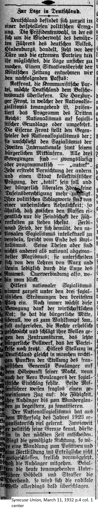 March 11, 1932 page 4 _____ Rotfront (the Red Front,) the Communist Party wants to deliver Germany to the Bolsheviks. The Harzburg Front, in which National Socialism is predominant, presents the program of the Third Reich: Nationalism on socialistic principle or the reverse. The Iron Front represents the antagonist to National Socialism; it encompasses the Socialism of the Second Internationals along with its middle class followers. All three movements are unavoidably or programmatically for economic independence. Each wants to destroy the other system and national collectivism and no longer permit the justification of existence as a liberal, middle class model. Their political slogans are incredibly similar, so similar that only the enemies of their leaders seem to stand between the groups. Ferdinand Fried, who's made an effort to intellectually refine National Socialism, speaks about the end of Capitalism. However his theses are none other than nationalized Marxism. They differ from the teachings of Marx and Lenin only by the narrowness of their range. Cross connections whereever one looks. Hitler's National Socialism currently holds a wide berth from the three socialist movements. But thanks to economic need this movement is still growing. It has the core of the middle class, and when it came to the election it significantly weakened the right wing and pushed their waves against the Central Tower [Supporters of the Weimr Republic], the last stronghold of the middle class still boldly facing the political crisis. Hitler's position in Germany is similar in many important respects to the position of French General Boulanger during the height of his power, when the era of Boulanger's socialist impact failed. Both leaders undoubtedly exhibit a common trait: the ability to fanaticize their followers to the point of belief in miracles. National Socialism learned much organizationally from the failure of 1923. In the near future it may decide its political limitations. If it chooses the right course it may change in a positive direction and embrace continuing development towards measures sufficiently tolerable for its followers to endorse. Give the upper hand to the lower eschalon leaders Göbbels and Strasser, and the radical surge will soon tumble. |