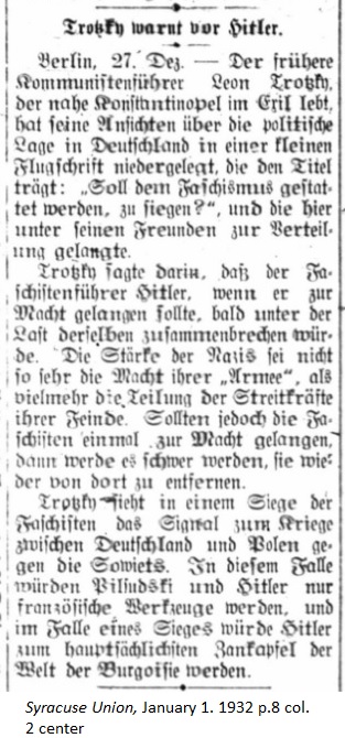 January 1, 1932 page 8 Berlin, December 27th. — The former Commmunist leader, Leon Trotsky, who lives in exile near Constantinople, has written down his opinions on Germany's political situation in a small flyer with the title "Should the Fascists be allowed to win?" and asked his friends to distribute it. Trotsky states within that the Fascist leader Hitler, if he comes to power, would soon collapse under the burden. The strength of the Nazis is not so much in the strength of its army but its troops' ability to divide its enemies. If the Fascists come to power, it would become difficult to remove them. Trotsky sees a victory by the Fascists as a signal to warfare between German and Poland against the Soviets. In this case Pilsudski and Hitler would become tools of the French. In the event of victory, Hitler would become the principle bone of contention for the world of the bourgeoisie. |