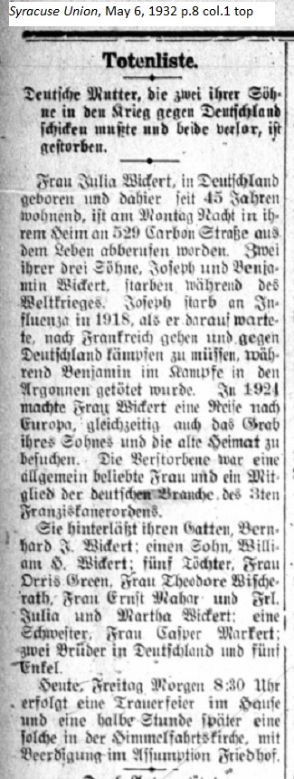 _____ Mrs. Julia Wickert, born in Germany and living here for the past 45 years, was called away from the living Monday night in her home on 529 Carbon St. Two of her three sons, Joseph and Benjamin Wickert, died during the World War. Joseph died of influenza in 1918 as he was waiting to go to France and fight against Germany. Benjamin was killed in the Battle of the Argonne. In 1924 Mrs. Wickert made a trip to Europe to visit the grave of her sons and her old homeland. The departed was a beloved wife and member of the German branch of the 3rd Franciscan Order. She leaves behind her husband, Bernhardt J. Wickert; one son, William H. Wickert; five daughters, Mrs. Orris Green, Mrs. Theodore Wischerath, Mrs. Ernst Mahar, Miss Julia and Miss Martha Wickert; one sister, Mrs. Caspar Markert; two brothers in Germany and five grandchildren. Today, Friday morning at 8:30 a memorial service is being held in the home and half an hour later a funeral service at the Church of the Assumption with burial at the Assumption Cemetery. |