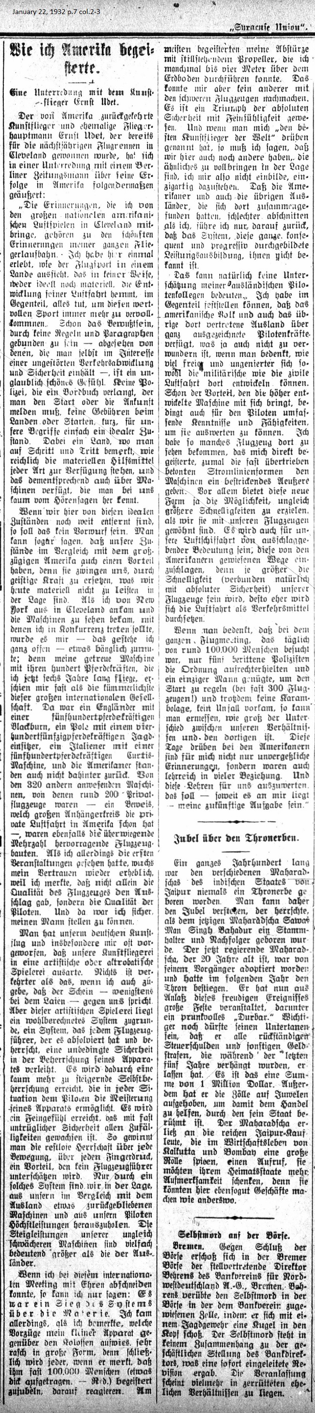 January 22, 1932 page 7 _____ An Interview with Stunt Pilot Ernst Udet "The memories which I bring back from the grand national American airshow in Cleveland belong to the most beautiful moments in my flying career. I experienced how aerial sports looks in a country that in no way is either imaginary or tangible. The evolution of aviation encompasses everything in order to constantly improve it as a worthy sport. Already the awareness, not bound by any rules or stipulations except for those which one observes in the interest of undisturbed traffic control and safety, is an incredibly fine feeling. No police asking for a log book, which one must produce at the start of a flight or at the point of arrival, no fees for takeoff or landing; in brief, to my mind, the ideal situation. Add to this in a country where one notices at every turn how ample material resources of all kinds are available along with the corresponding machinery to an extent one never hears spoken about in our country. If we here are so far away from this ideal situation, it's not a reproach. One can say that our circumstances in comparison with those of lavish America also present an advantage because it forces us to compensate with the power of intellect when we're not in position to acquire the necessary materials. When I arrived in Cleveland from New York and acquired the materials with which I could enter the competition, it was somewhat daunting — I often feel that way — my trusty machine with its hundred horsepower engine, which I had been flying for six years, seemed almost puny compared to this grand international entourage. There was an Englishman with a five hundred horsepower Blackburn, a Pole with a four hundred, fifty horsepower Jagd one-seater, an Italian with a five hundred horsepower Curtis engine, and the Americans didn't lag behind. Of the 320 other machines present, around 200 were privately owned aircraft — proof of the large number of devotees of private aviation in America, the overwhelming majority of which exhibired excellent aircraft construction. When I watched the first meets my confidence grew substantially because I noticed that not only did the quality of the aircraft tip the scales but also the quality of the pilots. And then I was certain I could enter my old man. People have often suggested our German stunt flying, and mine in particular, of being artistic or acrobatic shenanigans. There's nothing more incorrect, though I do admit, to the layman it must so appear. But behind this artistic gimmickry lies a well thought-out system which every fully-schooled aviator has mastered with an unconditional confidence in the control of his apparatus. It's achieved through an ever rising level of self control which allows the pilot complete mastery of his machine under every circumstance. A level of sensitivity has been achieved which evolved with almost infallible confidence in all eventualities. One gains utter dominence over every move, over every press of the finger; an advantage no aviator will underestimate. Only through such a system are we in the position to extract maximum performance from our somewhat antiquated machinery, when compared to the rest of the world, and our pilots. The ability to climb higher in our disparately weaker machines is significantly greater than that of the foreigners. If I could depart from this international meeting with honors, I can only say, it was a victory of the system over the equipment. I noticed what advantages my little plane had over the colossal ones, the rapid speed and the great form, then noticed that everyone watching, close to 100,000 people (Laying it on a bit thick — The Editor) rapt and cheering, I reacted. Most of all they were enthralled by my landing with a feathered propeller, which I accomplished some four meters above the ground. No one else was able to do that with their heavy aircraft. It has been a triumph of absolute confidence with delicacy. When they called me "the best stunt pilot in the world" I must respond that we have a lot more of them here who are in a position to execute similar maneuvers. I don't consider myself unique. That the Americans and the other foreigners who had gathered there together received poorer instruction leads me back to the point that it's due to the system, this complete, consistent and progressive competency training of which they are unaware. That doesn't mean I underestimate my foreign aviation colleagues. To the contrary, I can declare that the American people and those represented by other countries have command of excellent piloting skills even when you consider how very freely and unabashedly military and civilian aviation has developed. Even the advantages, which these highly developed machines offer, become a valuable part of the pilots' comprehensive knowledge and ability. I have been able to see so many airplanes there which have enchanted me, especially the exaggerated streamlined forms which give the machine a charming exterior. Above all else this new form offers the possibility of acccomplishing unparallelled speed, much greater than anything to which we are accustomed. This is also of huge significance for our airline flights because the greater the speed (naturally within limits of absolute safety) of our aircraft, the more we are able to establish air travel as a means of transportation. When one considers that the daily attendance at the flight meet was around 100,000 people with only five policemen mounted on horseback and only one man was needed to arrange takeoffs (with almost 300 aircraft!) and not even a single collision or injuries occurred, one can gage how large the difference is between our circumstances and theirs. These days over with the Americans are not only unforgettable memories but packed with lessons on many levels. And it will be my future task to assess just how valuable these lessons are — to whatever extent I am able. Jubilation for the Heir to the Throne