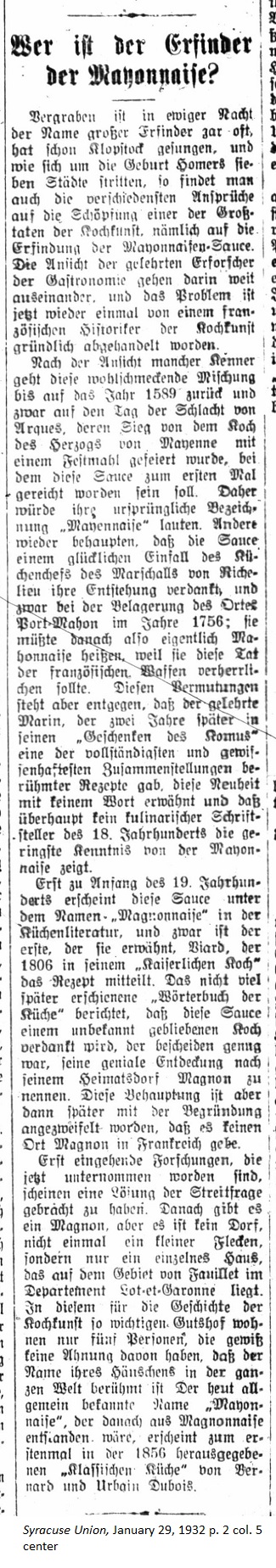 January 29, 1932 page 2 _____ Just as Klopstock often sang that buried in eternal darkness is the name of the great inventor and how seven cities argued over Homer's birth, so we have various versions concerning the creation of one of the great feats of cookery, namely the invention of mayonnaise sauce. Opinions among the learned researchers of gastronomy range widely and the problem is once again taken up by a French historian of culinary science. According to the opinions of some experts this great tasting mixture goes back to the year 1589 on the day of the Battle of Arques. To celebrate the victory the cook of the Duke of Mayenne prepared a feast at which this sauce supposedly was offered for the first time. Thus its original designation "Mayonnaise." Others contend that the sauce originated as a happy accident by the head chef of the Duke of Richelieu during the seige of Port Mahon in 1756. It must have been called Mahonnaise because it exalted the feats of French weaponry. However this interpretation stands in doubt because the scholar Marin two years later in his "The Gifts of Comus" gave the most complete and comprehensive compilation of famous recipes. No name was mentioned for this innovation and no culinary writer of the 18th century showed any knowledge of the word mayonnaise. For the first time at the beginning of the 19th century the name "mayonnaise" appeared in culinary literature when it was mentioned by Viard, who in 1806 published the recipe in his Kaiserlichen Koch (Imperial Cook.) Not long afterwards the published Würterbuch der Küche (Vocabuary of the Kitchen) reported that it is grateful for this sauce created by an unknown cook, who was humble enough to call his ingenious descovery after his home village of Magnon. This statement was later discounted because there is no region called Magnon in France. Ongoing research, which is currently being conducted, seems to have brought a resolution to the disputed issue. There is a Magnon, but it's not a village and not even a small plot of land but a house located in the region of Fauillet in the Department Lot-et-Garonne. In this manor, so important to the history of the culinary arts, five people reside, who certainly have no inkling that the name of their house is famous throughout the entire world. The generally recognized term "mayonnaise," which may have originated as Magnonnaise, seems to have been published for the first time in 1856 in the Klassischen Küche (Classic Cuisine) of Vernard and Urbain Dubois. |