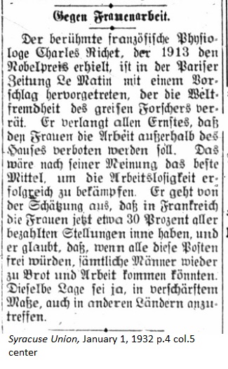 January 1, 1932 page 4 _____ The famous French physiologist Chalres Richet, who received the Nobel Prize in 1913, made a suggestion in the Parisian newspaper Le Matin which reveals the unworldliness of the old researcher. He earnestly claims that women should be forbidden from working outside the home. In his opinion it's the best way to successfully fight against unemployment. He bases this on the estimate that in France women hold around 30 percent of all paid positions and he believes that if all these posts were vacant, all men would be employed. This contention may also arise in large measure in other countries experiencing the same problem. |