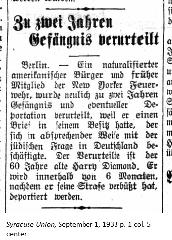 September 1, 1933 page 1 _____ Berlin. — A naturalized American citizen and former member of the New York Fire Department was recently sentenced to two years in prison and eventual deportation because he had a letter in his possession which deals with the Jewish question in Germany in a derogatory manner. The convicted man is 60 year old Harry Diamond. He will be deported within 6 months after he serves his sentence. |