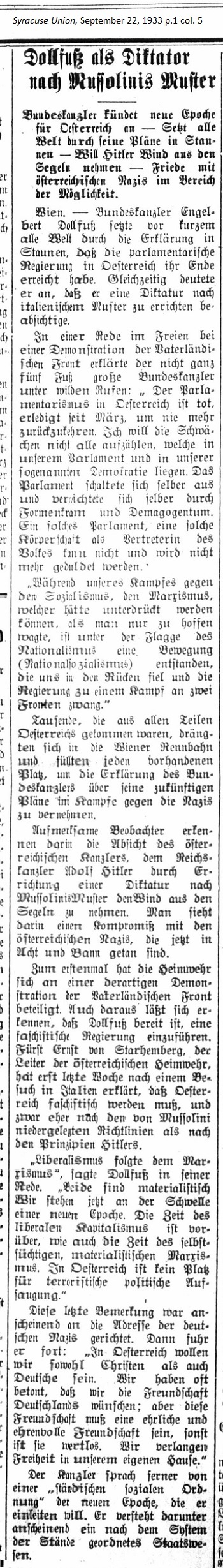 September 22, 1933 page 1 Dollfuss as Dictator in accordance with Mussolini's Model _____ Federal Chancellor announces a new Era for Austria — All the World astonished by his Plans — Will take the Wind out of Hitler's Sails — Peace with Austrian Nazis in the Realm of Possibilities. At an open air speech during a demonstration by the Fatherland Front, the not-quite five-feet tall Federal Chancellor stated amid wild cheering, "Parliamentarianism in Austria is dead, finished since March , never to return. I will not enumerate all the weaknesses which lie in our Parliament and our so-called democracy. The Parliament turned itself off and destroyed itself through formalism and demagoguery. Such a Parliament, such a corporate body representing the people, cannot and will not be tolerated any more!" "While we were fighting to put down Socialism and Marxism, a movement came about under the flag of Nationalism (National Socialism) which came at us from behind and forced the government to fight on two fronts." Thousands, who came from all parts of Austria, pressed into the Vienna Race Grounds and filled every available seat to hear the Federal Chancellor's future plans in the fight against the Nazis. Alert observers learned of the Austrian Chancellor's intentions to take the wind out of Adolf Hitler's sails by establishing a dictatorship according to Mussolini's model. In it one sees a compromise with the Austrian Nazis, who currently are outlawed and banned. For the first time the Heimwehr (Home Guard) took part in the same demonstration as the Fatherland Front. It was also made known that Dollfuss is prepared to install a fascist government. Prince Ernst von Starhemberg, the leader of the Austrian Home Guard, stated just last week after a visit to Italy that Austria must become fascist in accordance with the Mussolini's guidelines rather than according to Hitler's principles. "Liberalism followed Marxism," Dollfuss said in his speech. "Both are materialistic. We currently stand at the threshold of a new era. The time of liberal capitalism is over, just as is the time of self-seeking, materialistic Marxism. In Austria there is no place for terroristic political absorption." This last comment was apparently directed to the address of the German Nazis. Then he continued. "In Austria we want to be as much Christian as German. We have often emphasized that we want friendship with Germany; but this friendship must be honest and honorable, otherwise it is useless. We demand freedom in our own house." The Chancellor spoke further of a "corporate social ordering" of the new era, which he will introduce apparently by this he understood a system of nation-wide corporatism. |