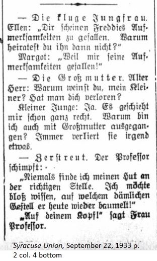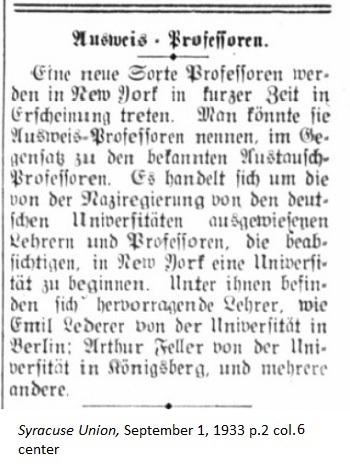 September 1, 1933 page 2 _____ A new kind of professor will arrive in New York within a short time. One may call them German Identity Card Professors, as contrasted with the well-known foreign exchange professors. These are teachers and professors expelled from German universities by the Nazi government, who intend to begin anew at a New York university. There are many excellent teachers among them, such as Emil Lederer of the University of Berlin and Arthur Feller of the University of Königsberg. |