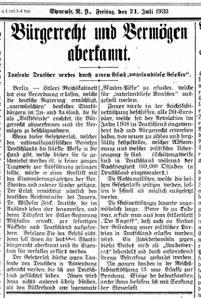 July 21, 1933 page 2 Citizenship and Assets Revoked _____ Thousands of Germans become "Fatherlandless" by New Decree _____ When this legislation is carried out to its fullest potential, it gives National Socialist officials of Germany the strongest weapon ever forged for them and it would lead to conflict with the immigration laws of the United States and other countries. The regulation empowers the German Minister of the Interior, Dr. Wilhelm Frick, to demand the immediate return of Germans to Germany who live or travel abroad and whose activities arouse the displeasure of the Hitler government. If they do not heed the order to return, then their German citizenship can be revoked and their property can be declared abandonned. The legislation might be used against thousands of Germans, who have fled Germany. Then their only recourse would be to request a "Nansen Passport" from the League of Nations, which is issued to stateless individuals. Additionally in the Reich Cabinet meeting it was decided to recount the number of all Eastern Europeans who immigrated to Germany since the Revolution of 1918 and acquired citizenship then thoroughly establish which ethnicity and political affiliation they have. (It's estimated that during the postwar years 160,000 Eastern Jews migrated to Germany.) The lists being issued due to both these decrees should be completed as quickly as possible. The Cabinet session was unusually long. Before it ended it was learned from the Hitler newspaper, Der Angriff (The Attack,) that there would also be a ban on the establishment of new political parties in Germany. Actions contrary to this ban will be considered treasonous and correspondingly stringent punishment will be issued. In total there are 13 new regulations under consideration in the Reich Cabinet. One of the most significant among them deals with the lowering of the tax burden. |